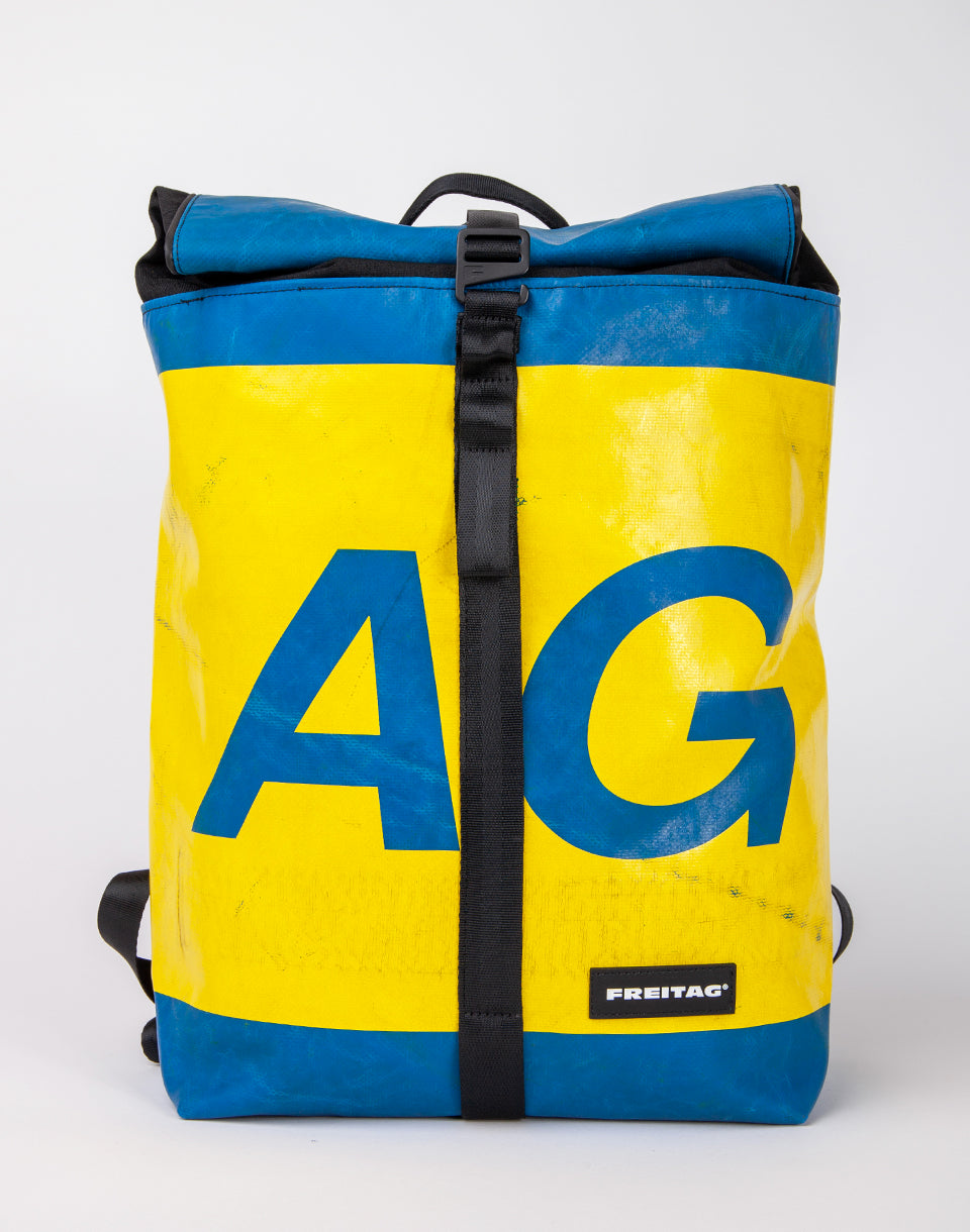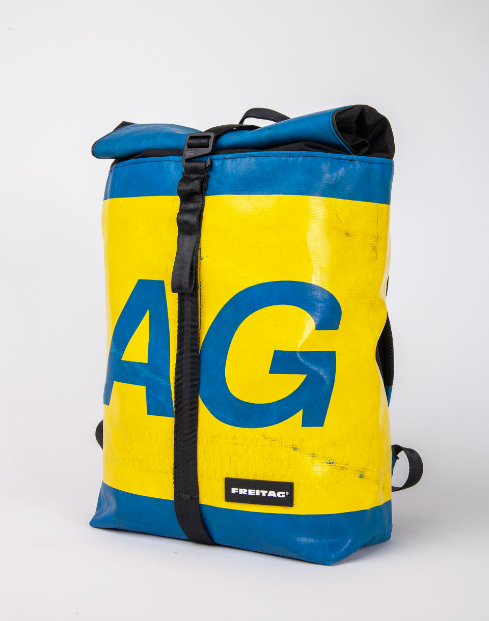 FREITAG F155 Clapton - a unique handmade rolltop backpack made from used truck tarps, seat belts and recycled PET bottles.
