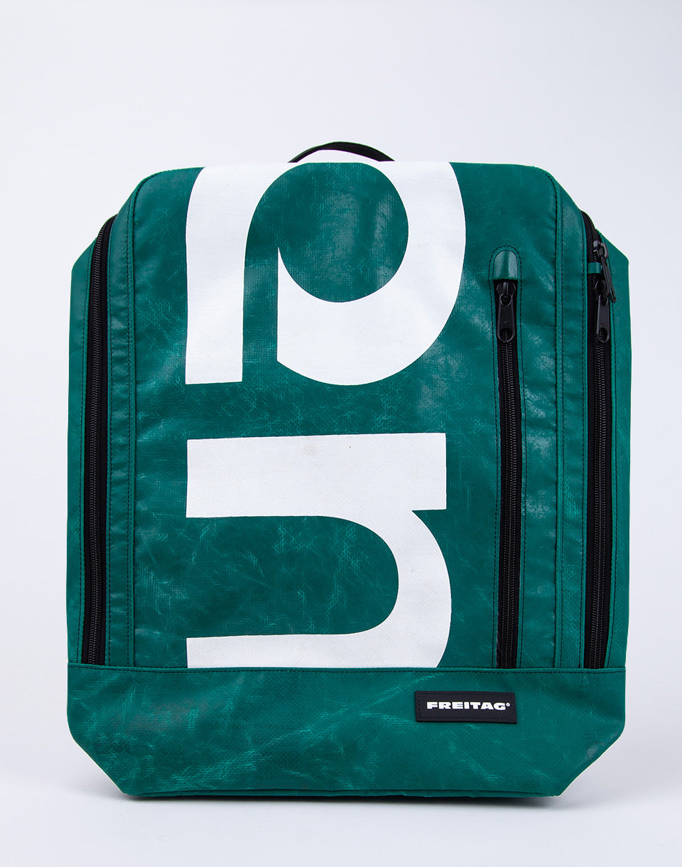 FREITAG F306 Hazzard - hand-cut and sewn Swiss backpack made from used truck tarps and seat belts.