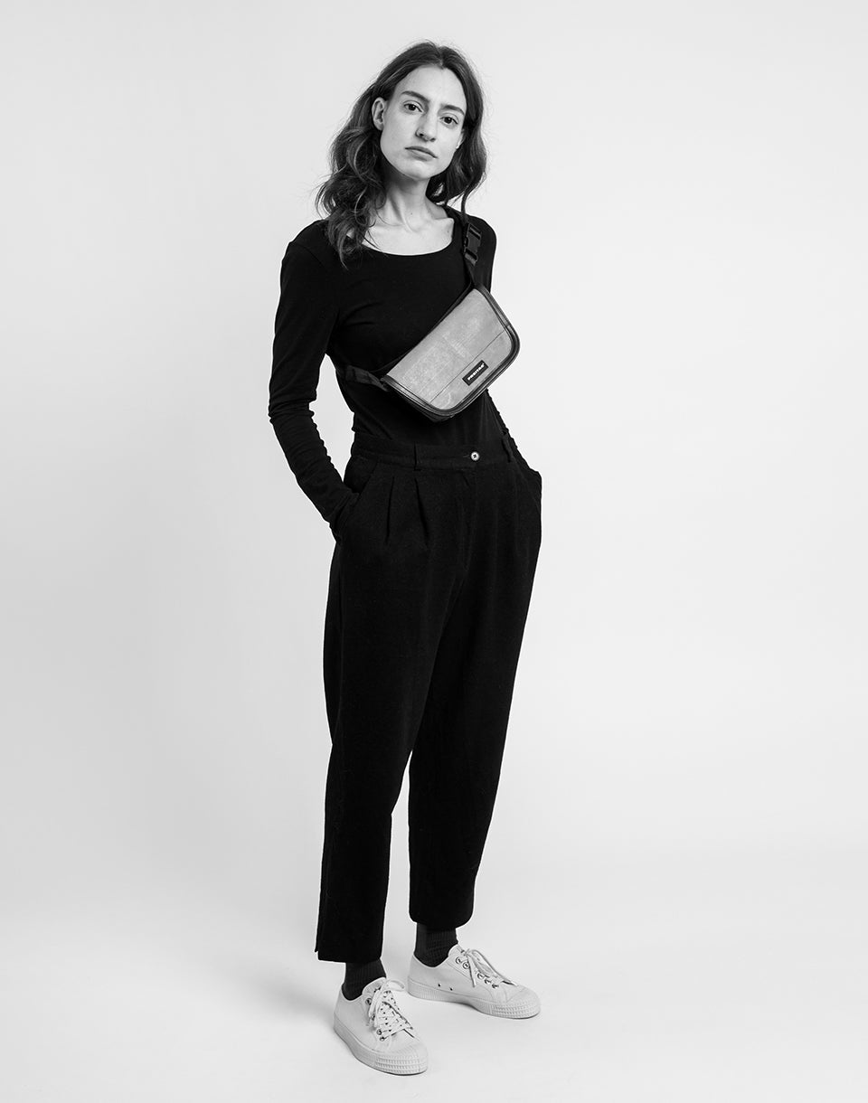 The F40 Jamie is a compact kidney that offers more than meets the eye. The minimalist design hides a practically structured interior, a comfortable shoulder strap and material that will last. Made from upcycled truck tarpaulin - so not only does each piece look different, but each has had its own journey. Just strap it on and go.