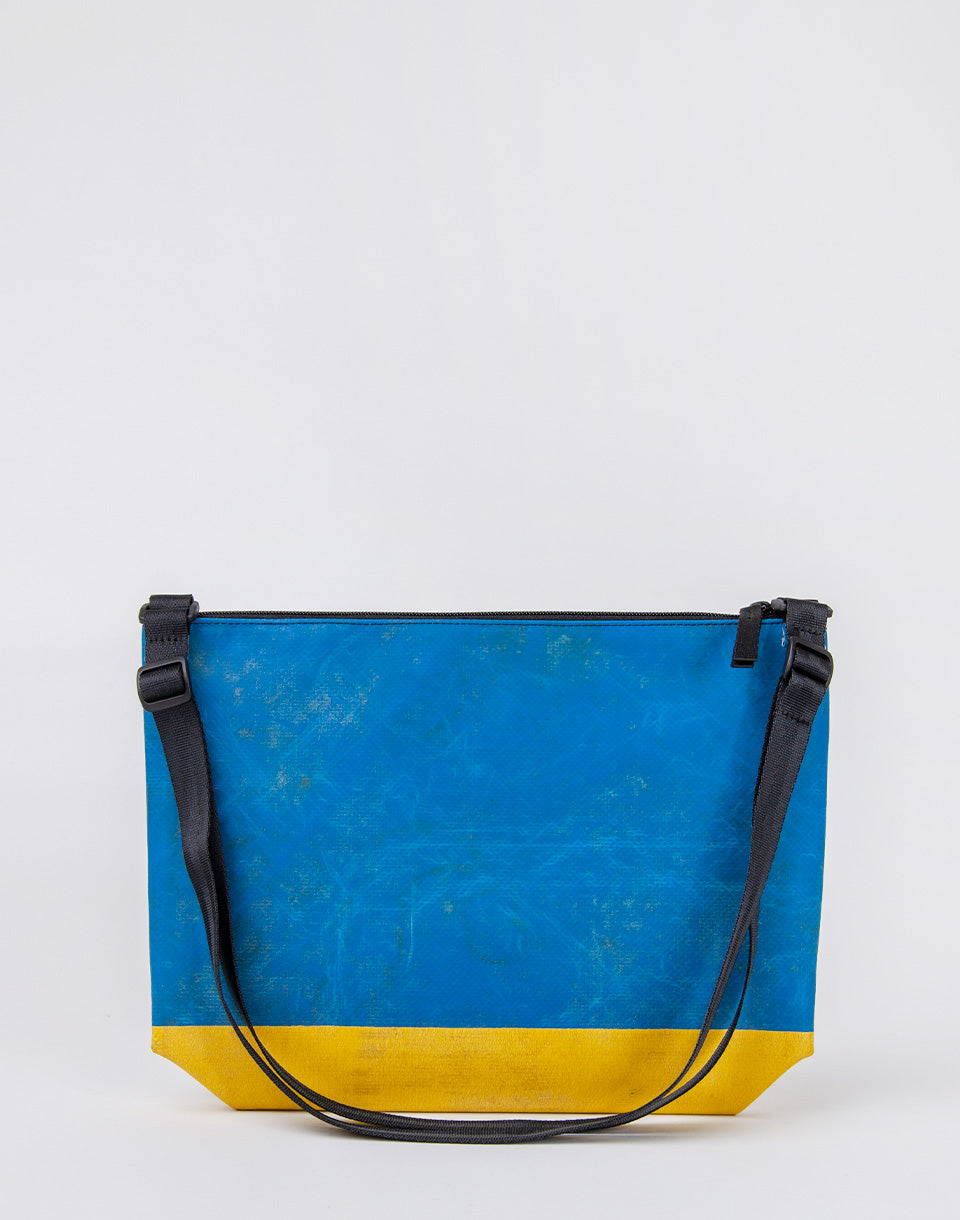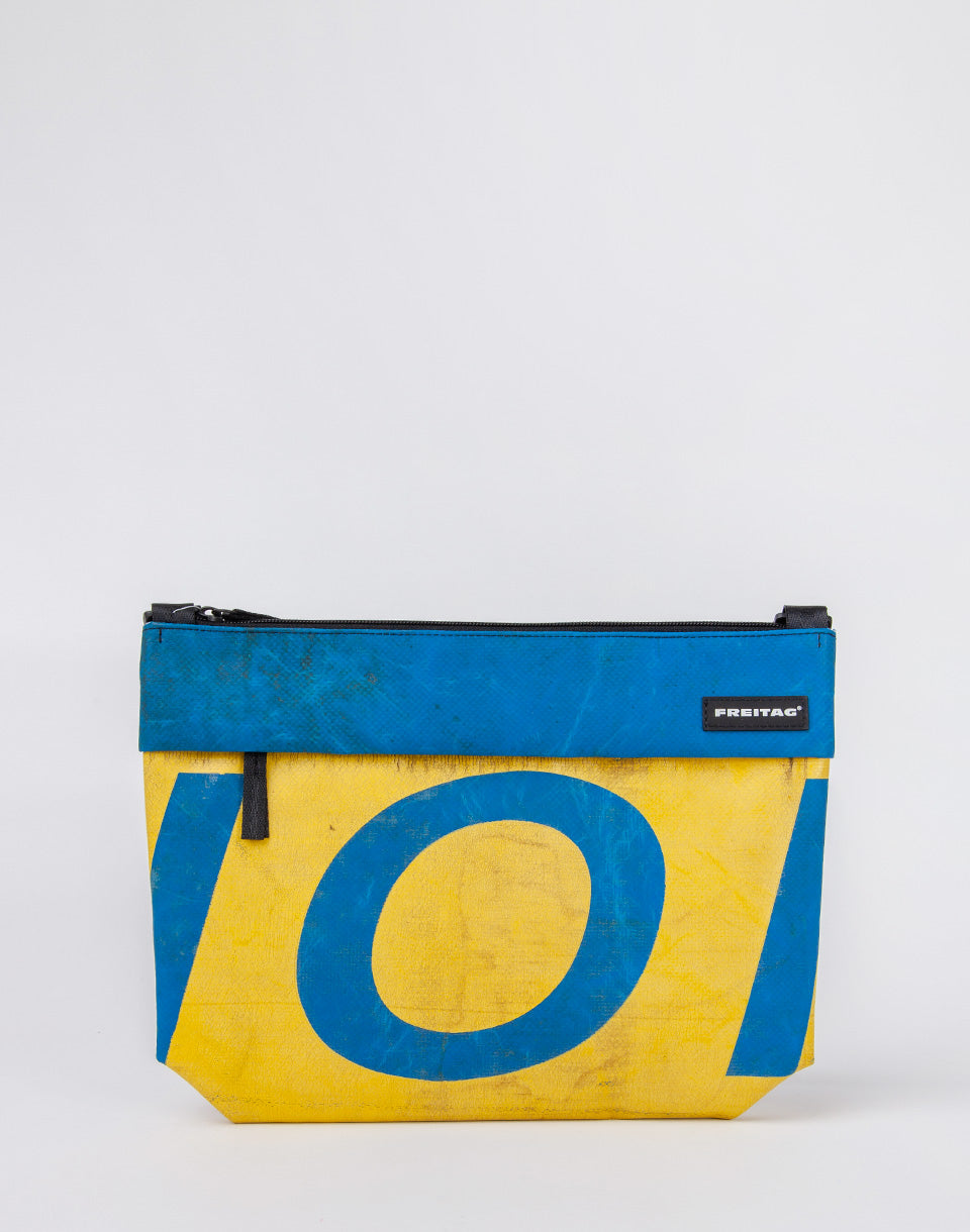 FREITAG F553 Lou - a unique crossbody made from used truck tarps, using old seat belts and inner tubes from bicycles, all hand-cut and sewn.