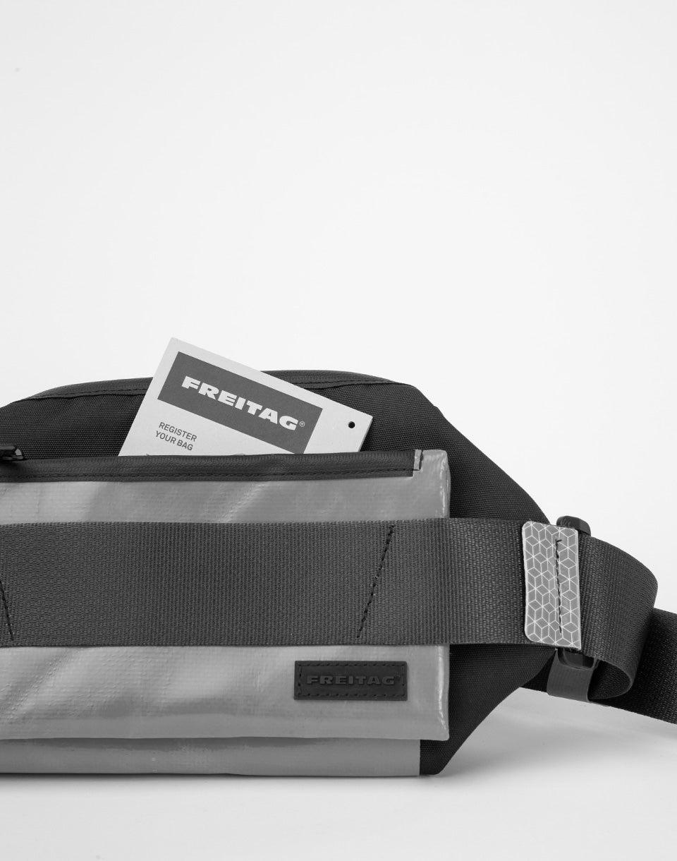 FREITAG F675 DIXON - reflective, recycled and unique sling bag made from recycled PET bottles, discarded truck tarp, reflective recycled truck contour markings and B-stock car safety belts.