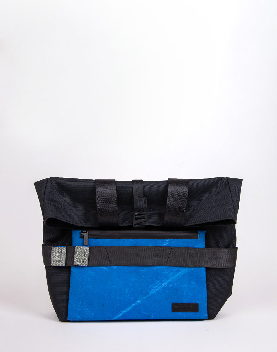 FREITAG F680 Anderson - expandable bag with adjustable shoulder strap that can be carried in the hand as a tote bag. It's made from recycled PET bottles and complete with parts of retired truck sails, including recycled reflective markings.
