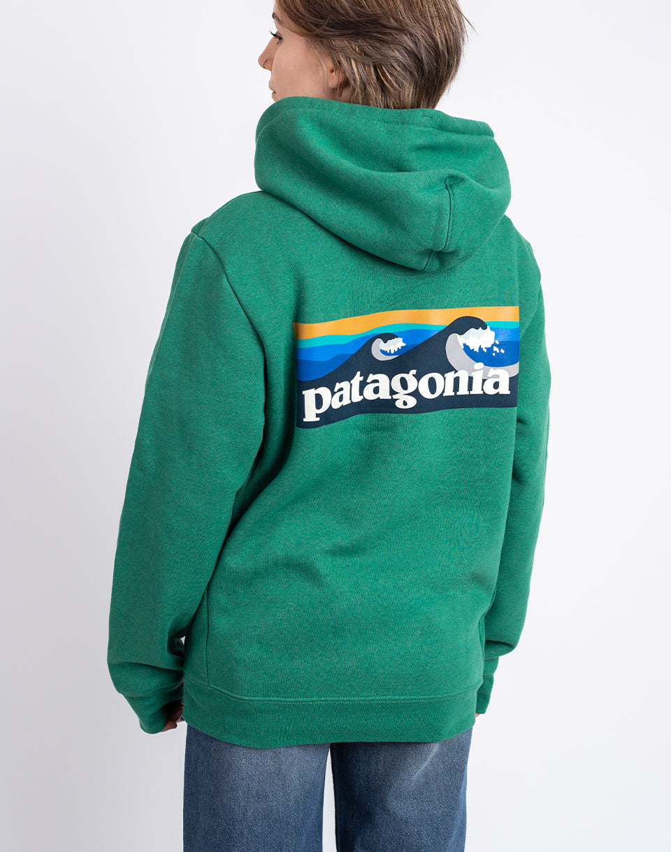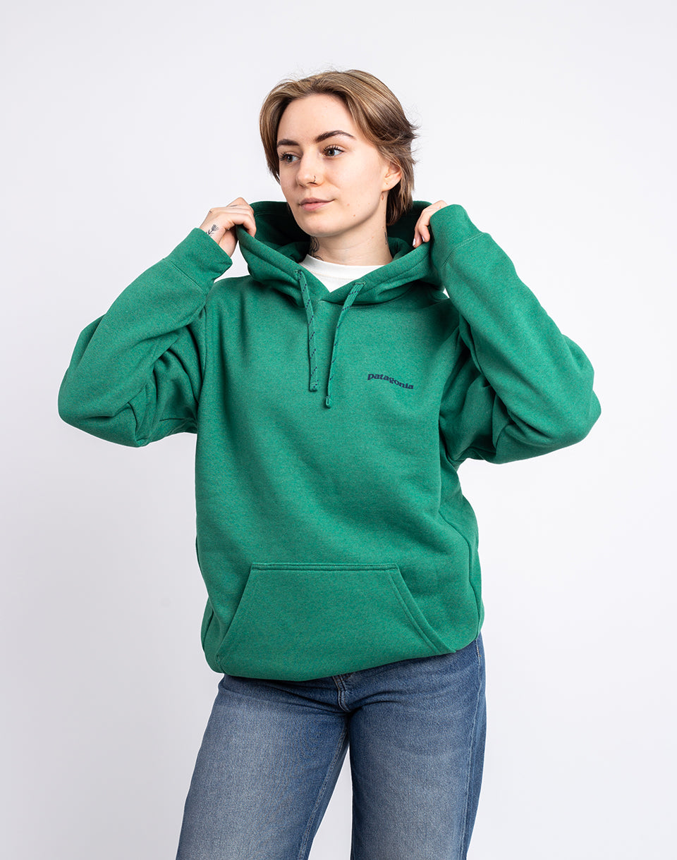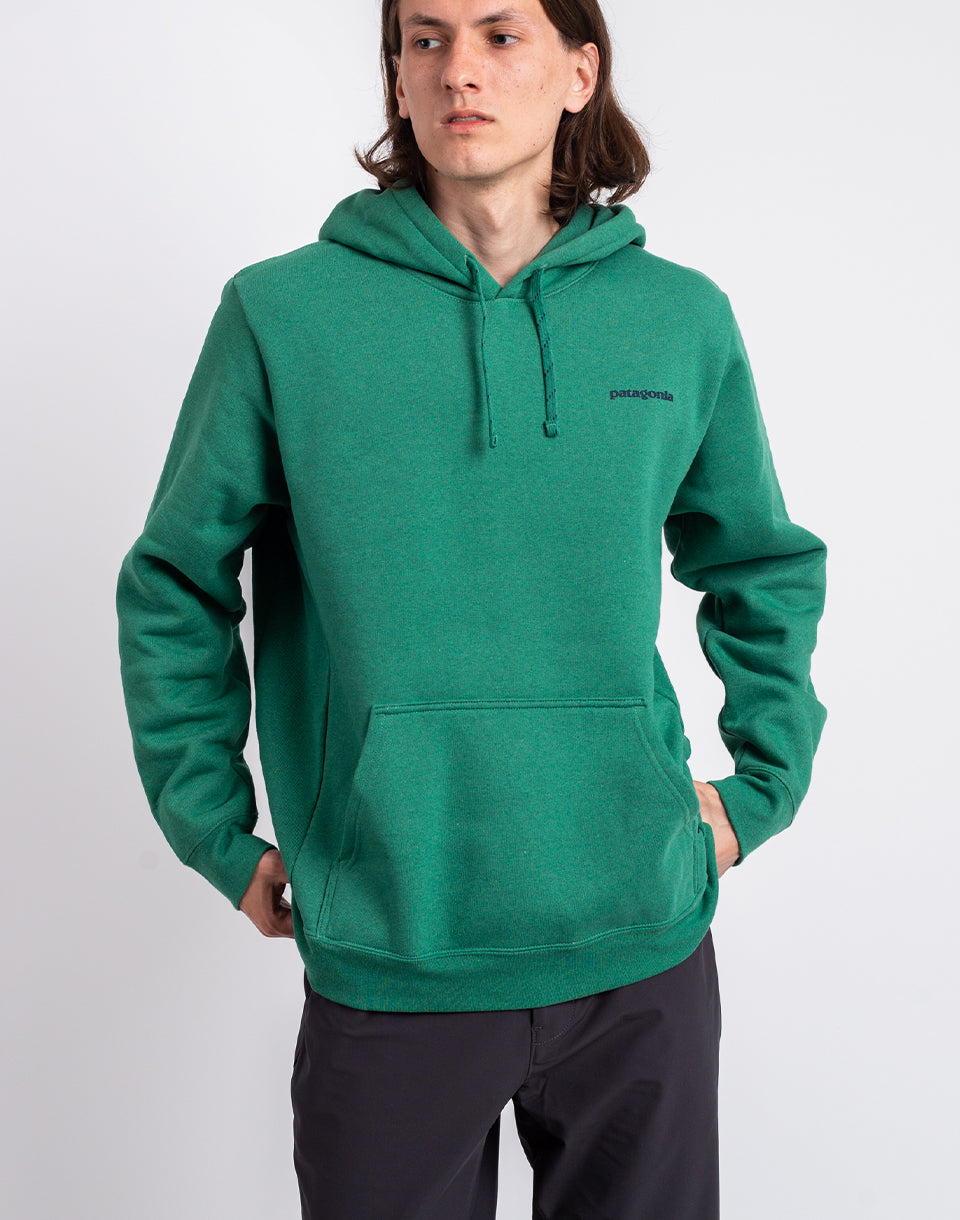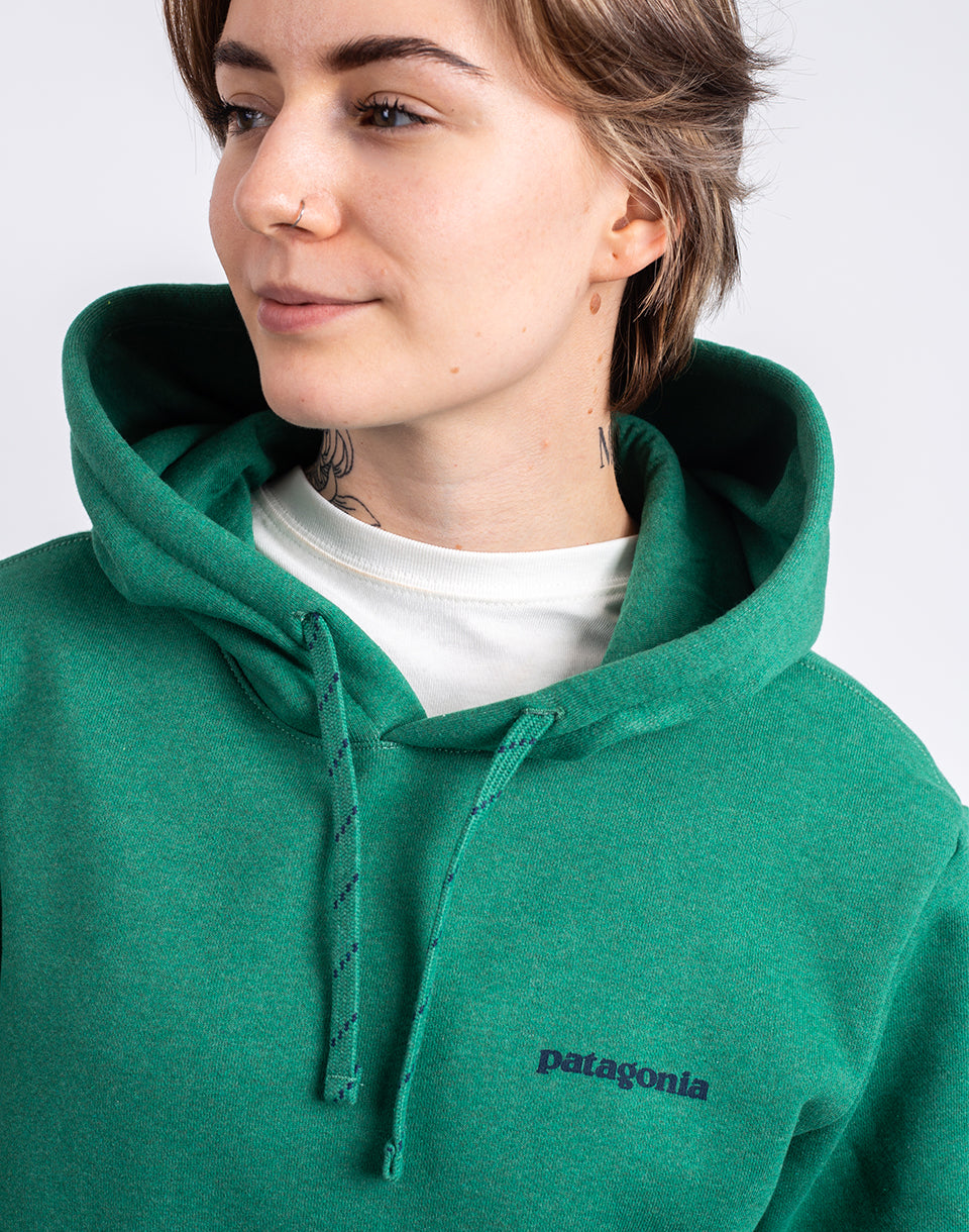 Patagonia Boardshort Logo Uprisal Hoody - a unisex fleece hoodie made from a 100% recycled polyester/cotton blend that is Fair Trade certified.