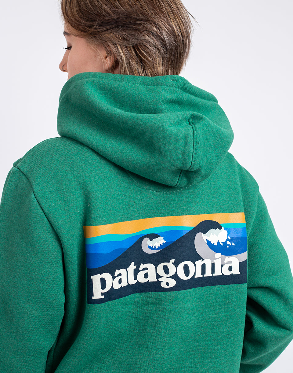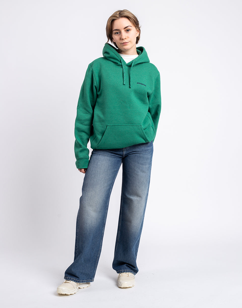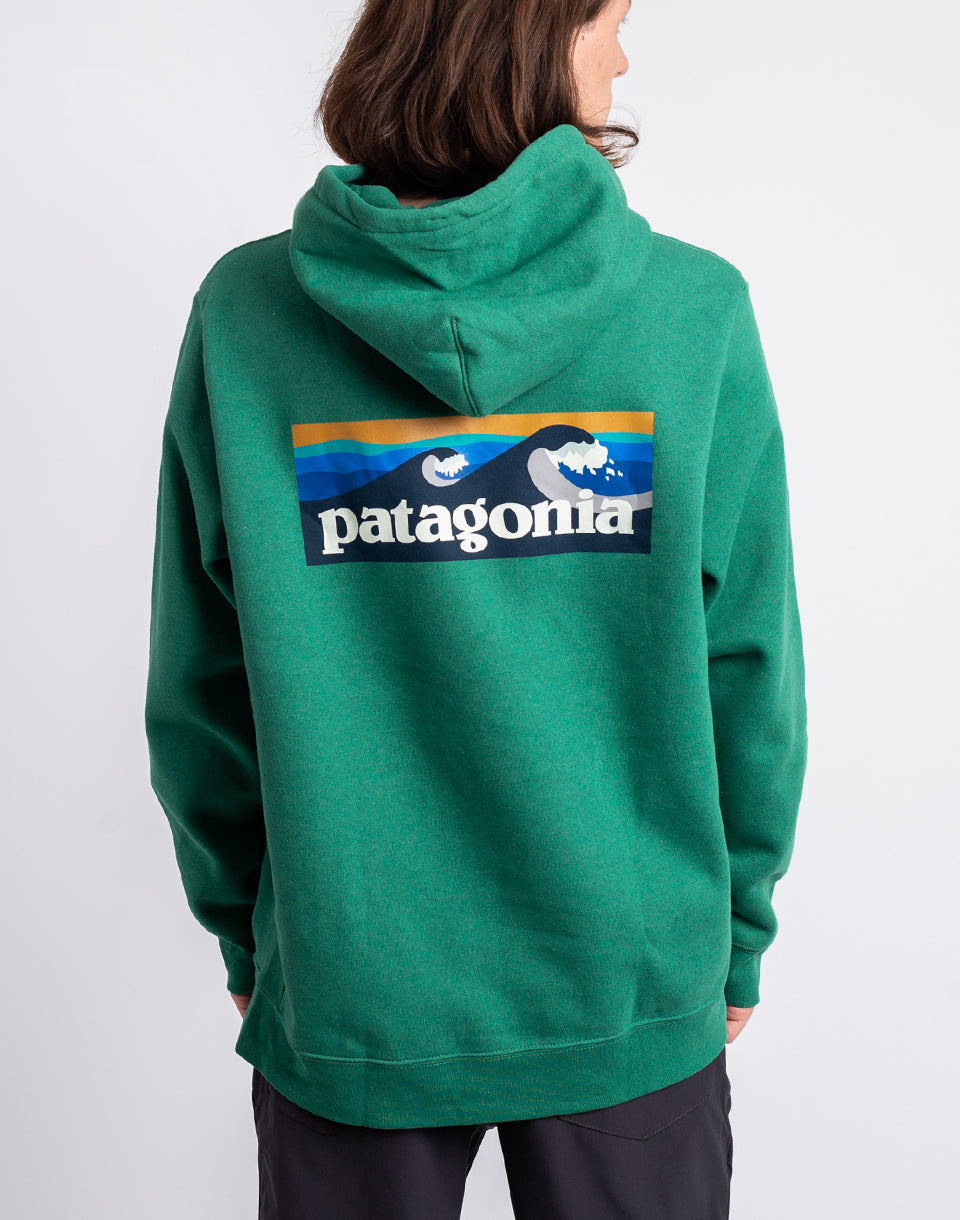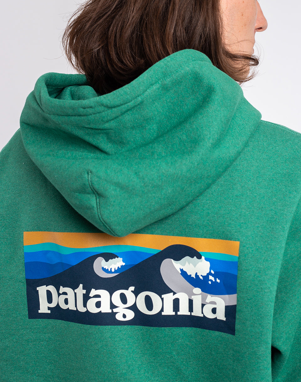Patagonia Boardshort Logo Uprisal Hoody - a unisex fleece hoodie made from a 100% recycled polyester/cotton blend that is Fair Trade certified.