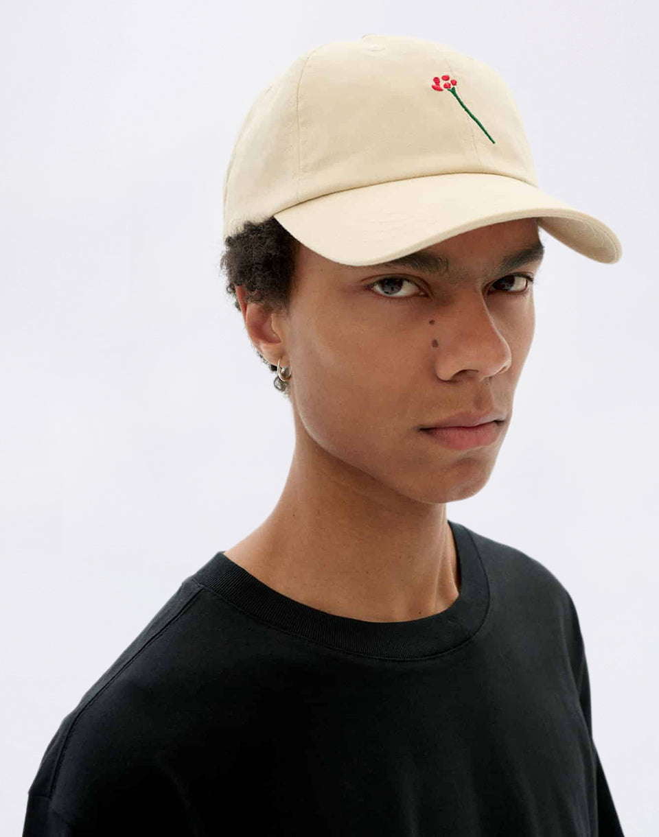 Thinking MU Ivory Flower TM Chris Cap - Organic cotton cap with delicate floral embroidered motif.