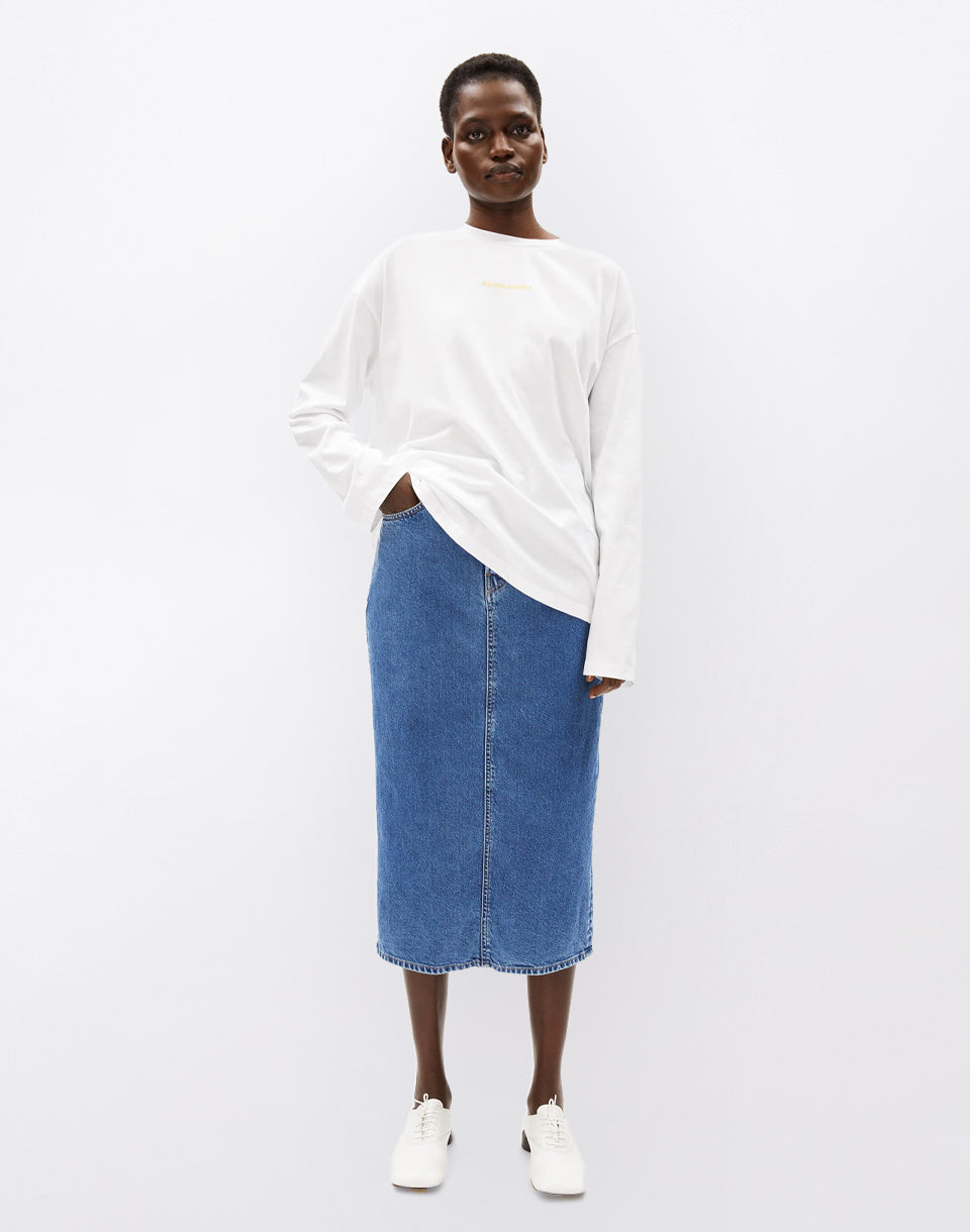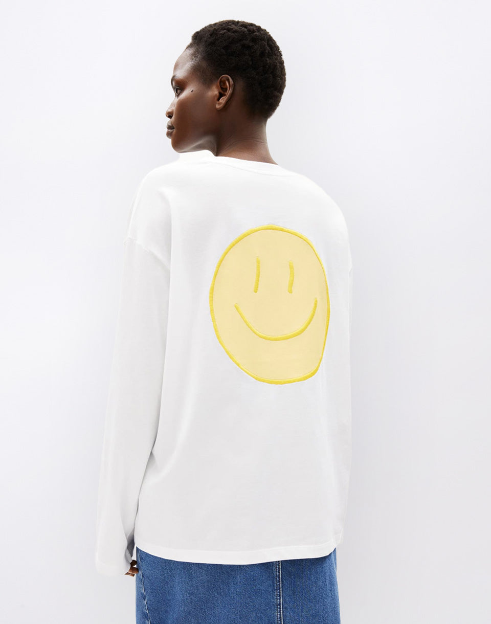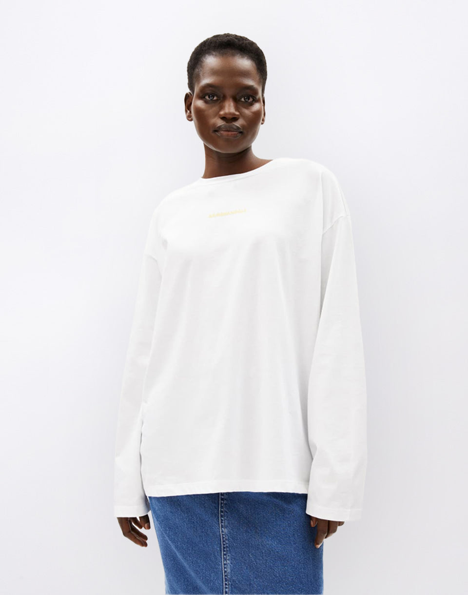 Armedangels Fietaa Smile - Un t-shirt oversize à manches longues fabriqué au Portugal en coton biologique avec une grande broderie dans le dos et un petit lettrage sur la poitrine.