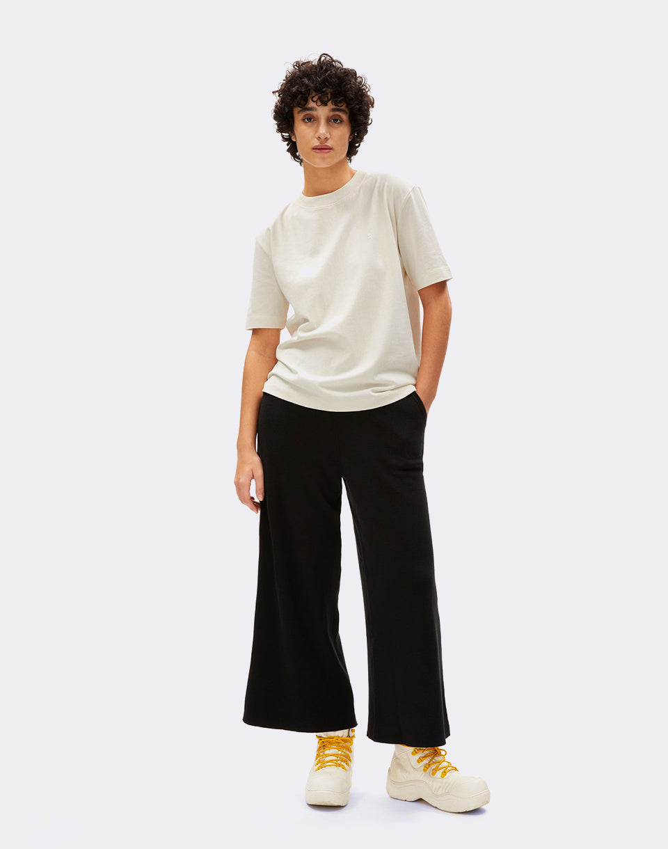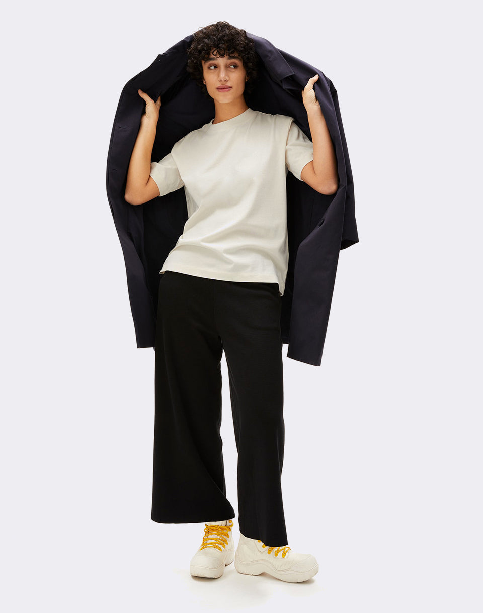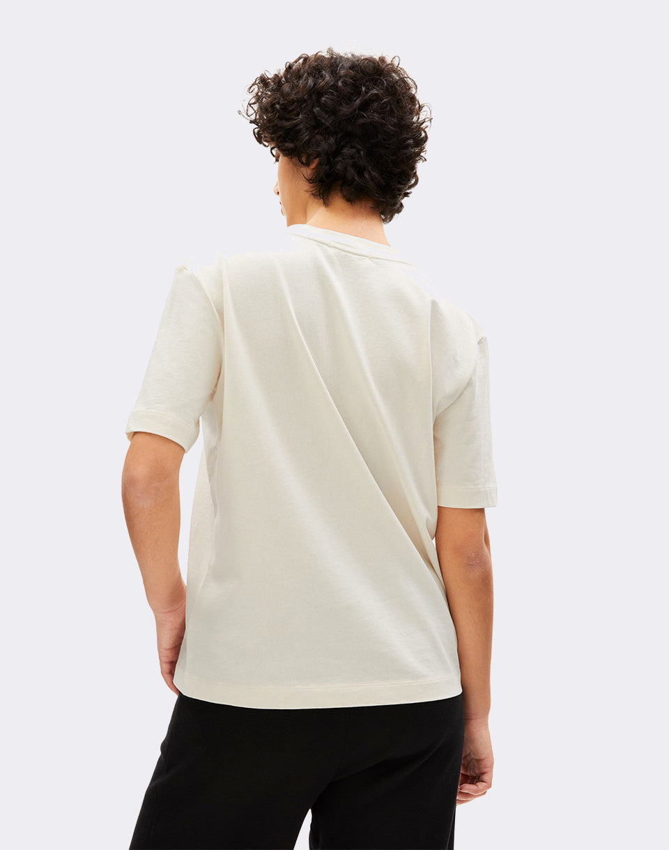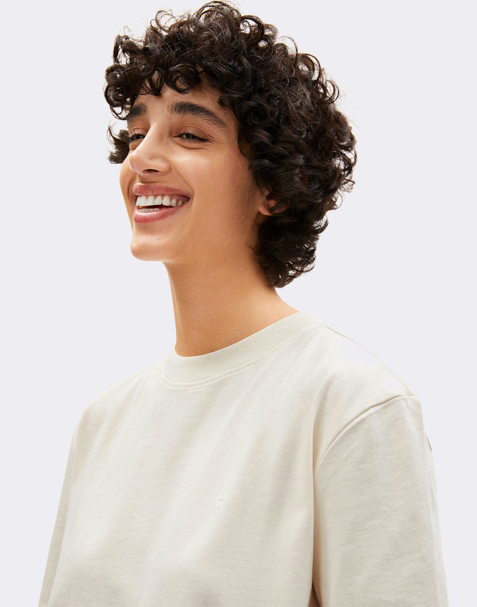 Armedangels Tarjaa - Un t-shirt féminin monochrome de la collection spéciale Unied, qui est assez fabriquée à partir d'un mélange de coton recyclé et biologique. De plus, les vêtements de la collection Unyed ne sont pas teints avec une teinture, de l'économie d'eau, des produits chimiques et de l'énergie pendant la production.