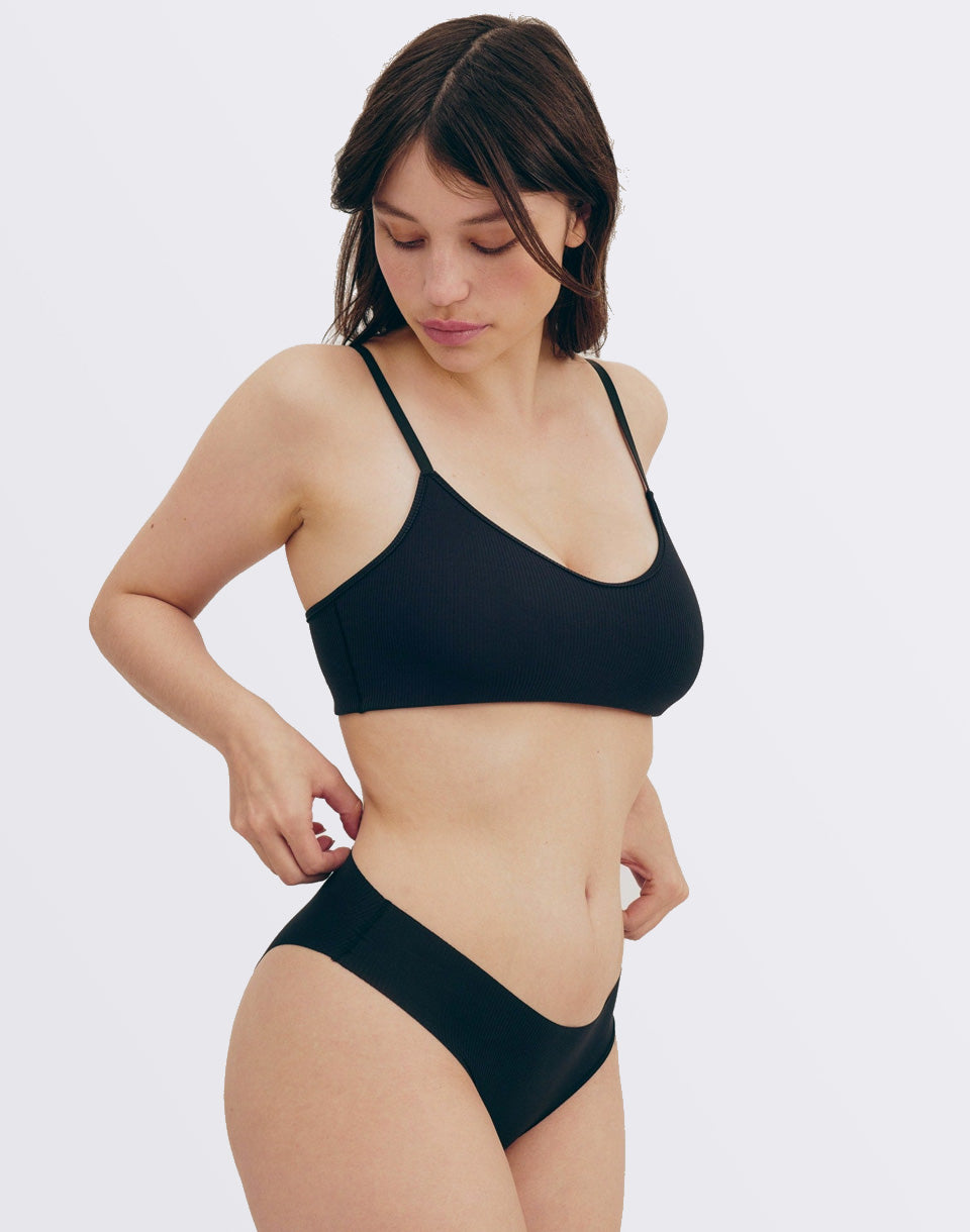 Brécédées biologiques Naked Rib Brief - culotte côtelée féminine avec ourlet lisses en nylon recyclé avec un gousset de coton cousu.