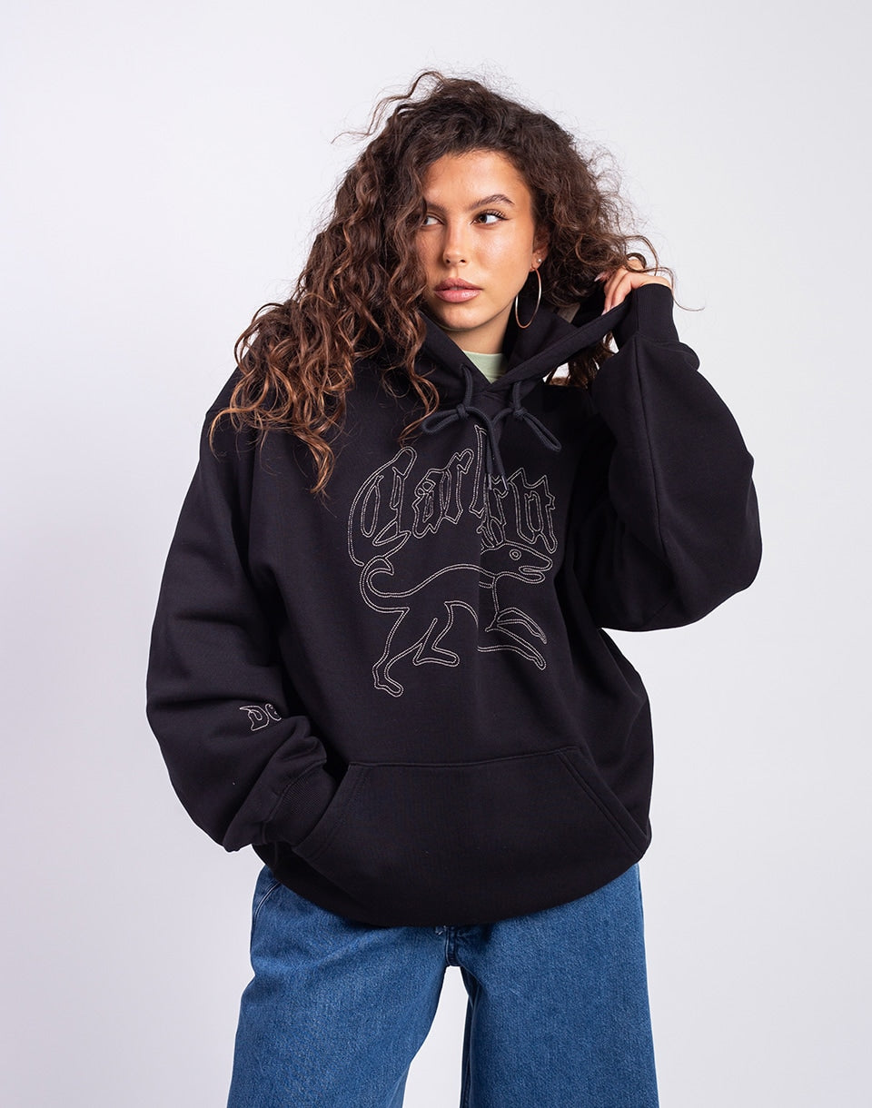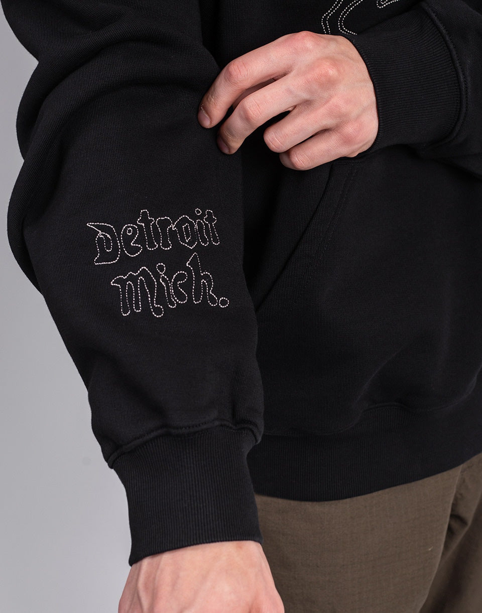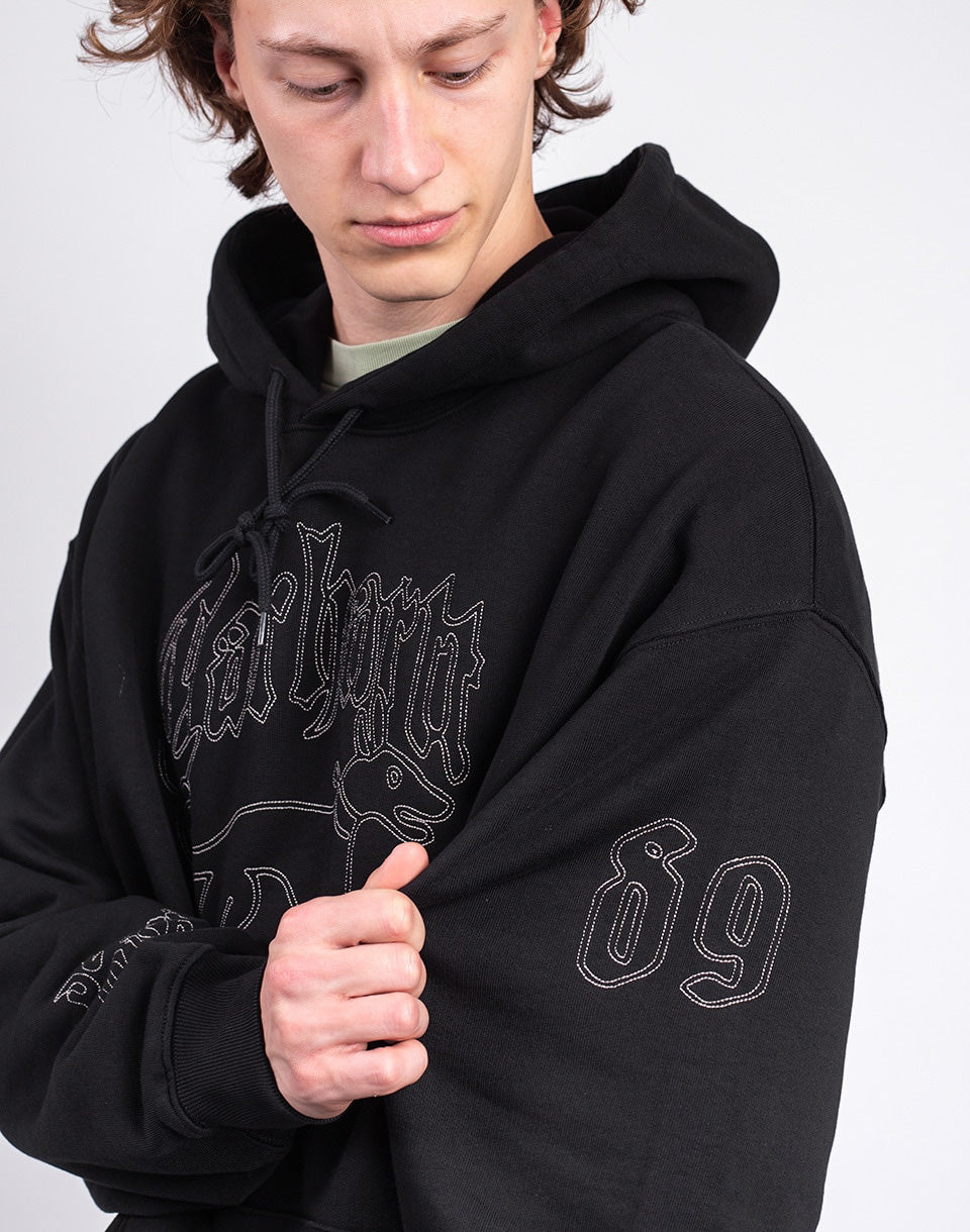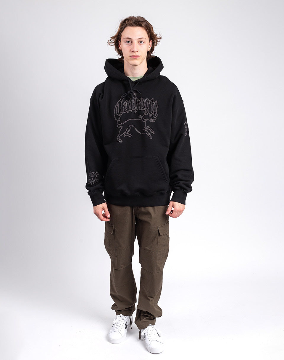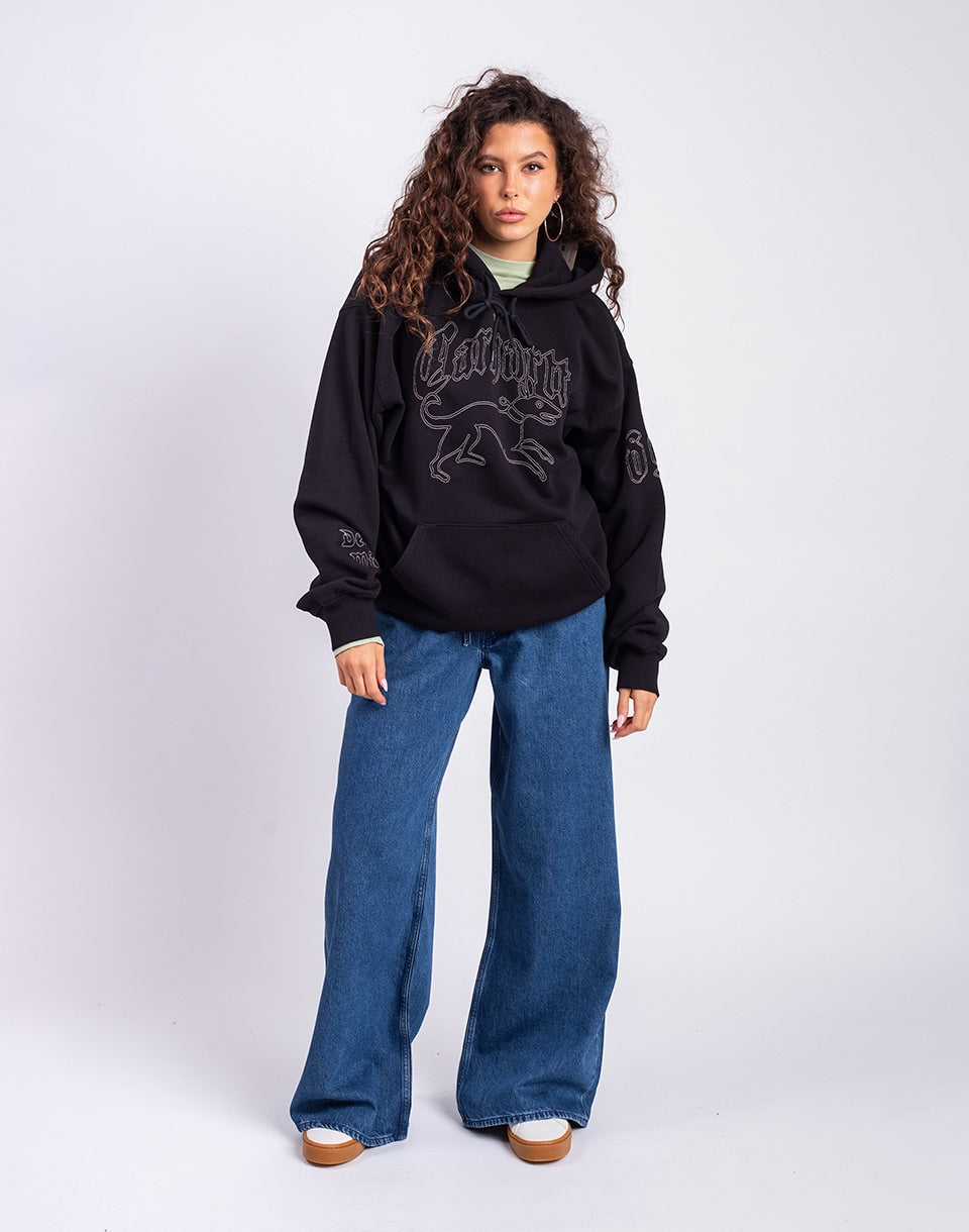 Carhartt WIP Hooded Hackwork Sweat - wide unisex hoodie with kangaroo pocket and large graphic embroidery on the chest and sleeves, backed by the famous streetwear brand.