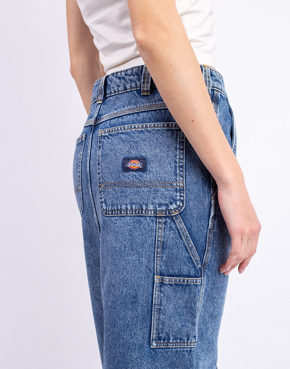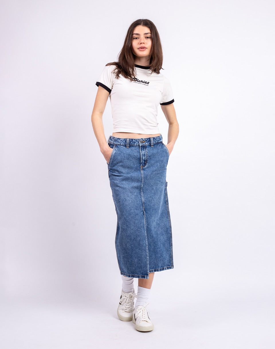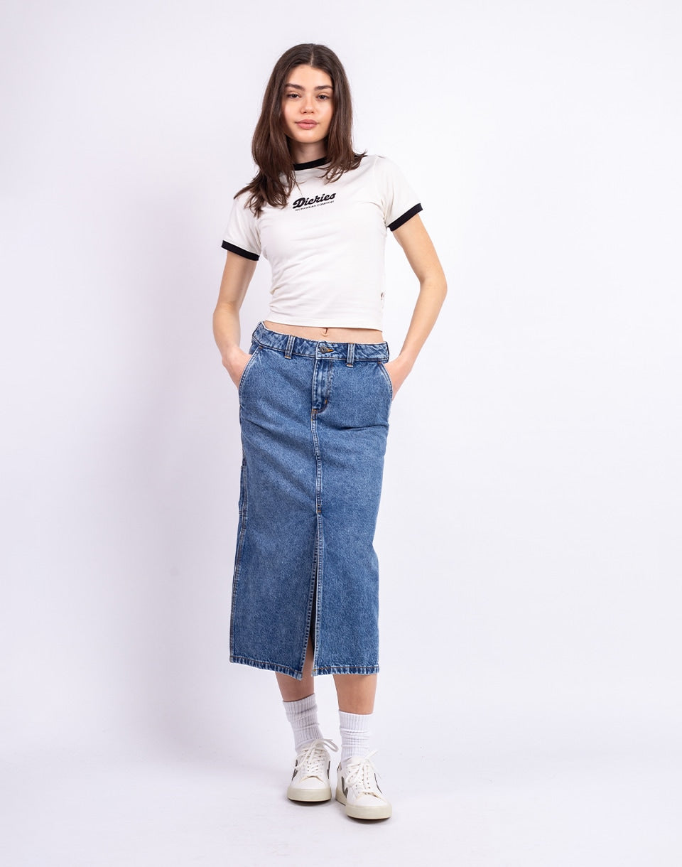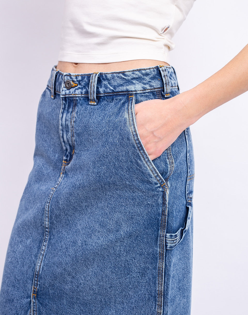 Jupe longue en denim de charpentier Dickies - Une jupe midi en denim pour femme avec une fente sur le devant qui présente des poches emblématiques et une boucle de marteau inspirée des vêtements de travail.