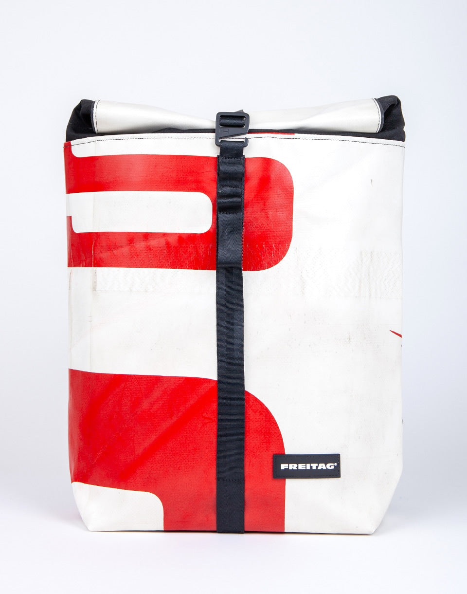 FREITAG F155 Clapton - un sac à dos à enroulement unique fait main à partir de bâches de camion usagées, de ceintures de sécurité et de bouteilles en PET recyclées.