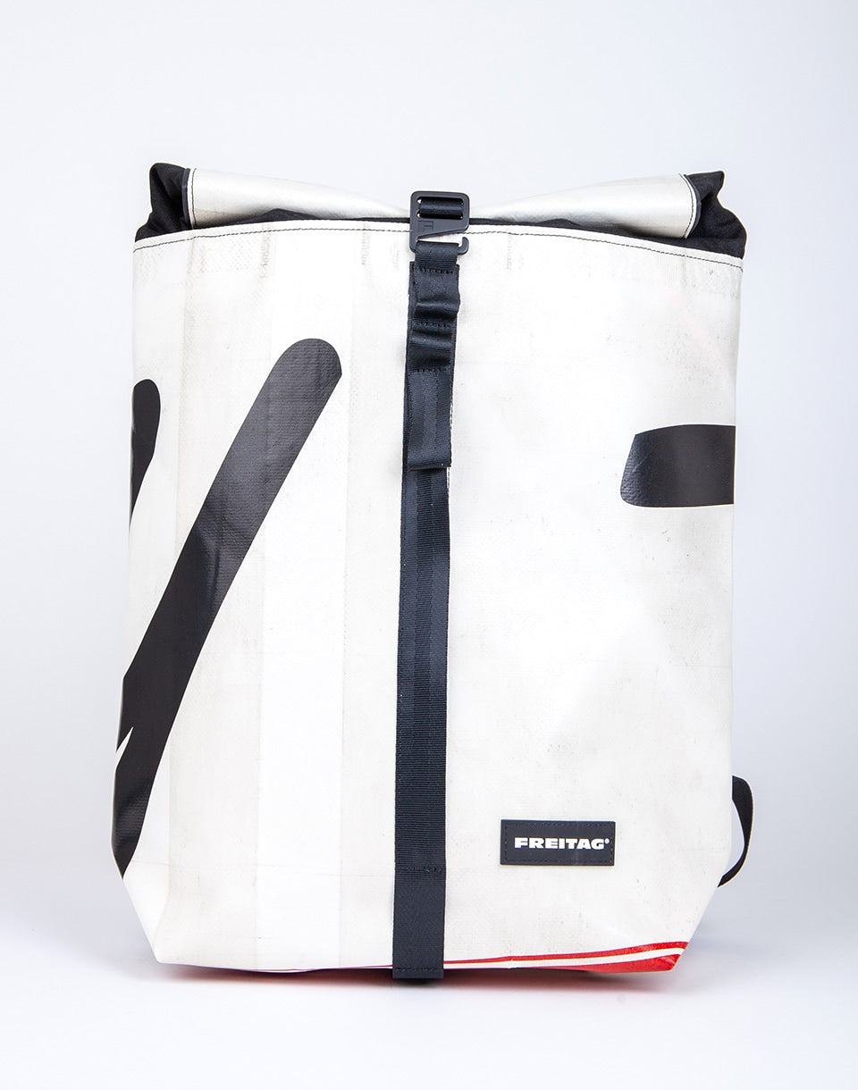 FREITAG F155 Clapton - un sac à dos à enroulement unique fait main à partir de bâches de camion usagées, de ceintures de sécurité et de bouteilles en PET recyclées.