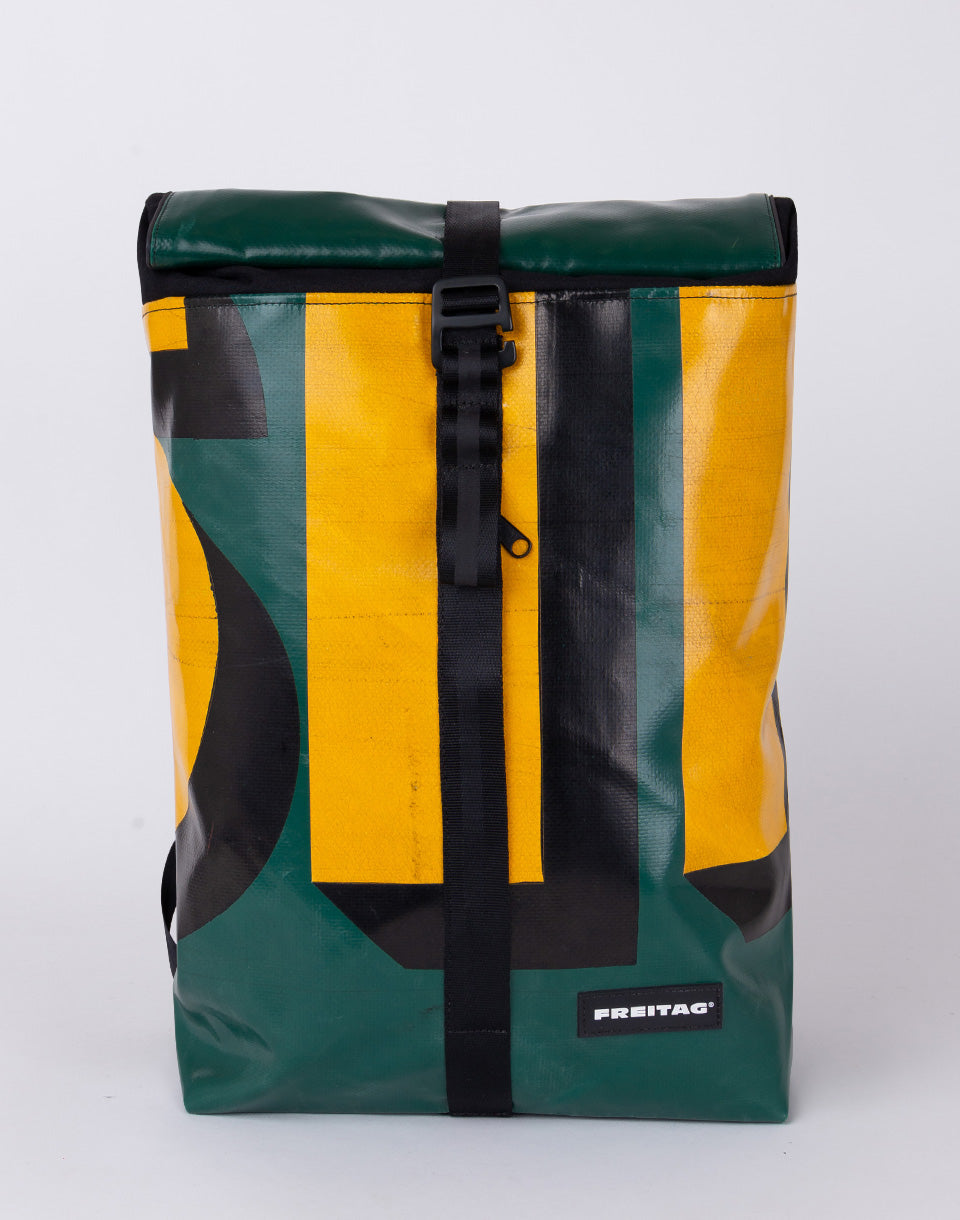 FREITAG F155 Clapton - a unique handmade rolltop backpack made from used truck tarps, seat belts and recycled PET bottles.
