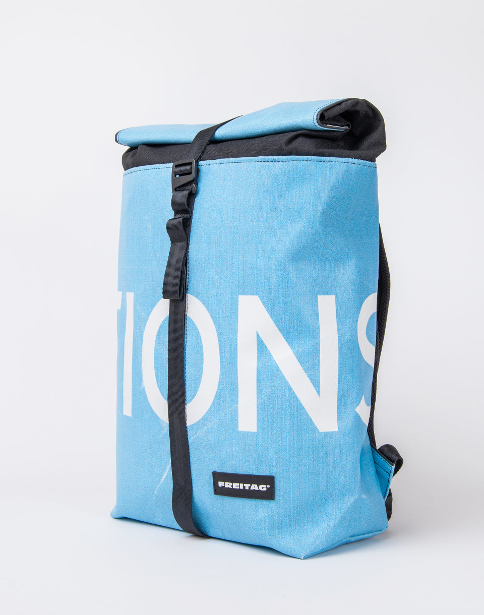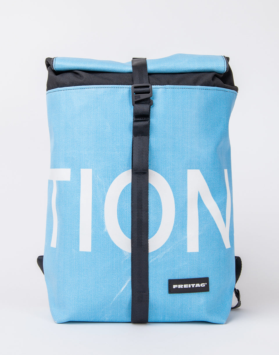 Freitag F155 Clapton - Un sac à dos unique fait à la main fabriqué à partir de bâches de camion d'occasion, de ceintures de sécurité et de bouteilles d'animaux recyclées.