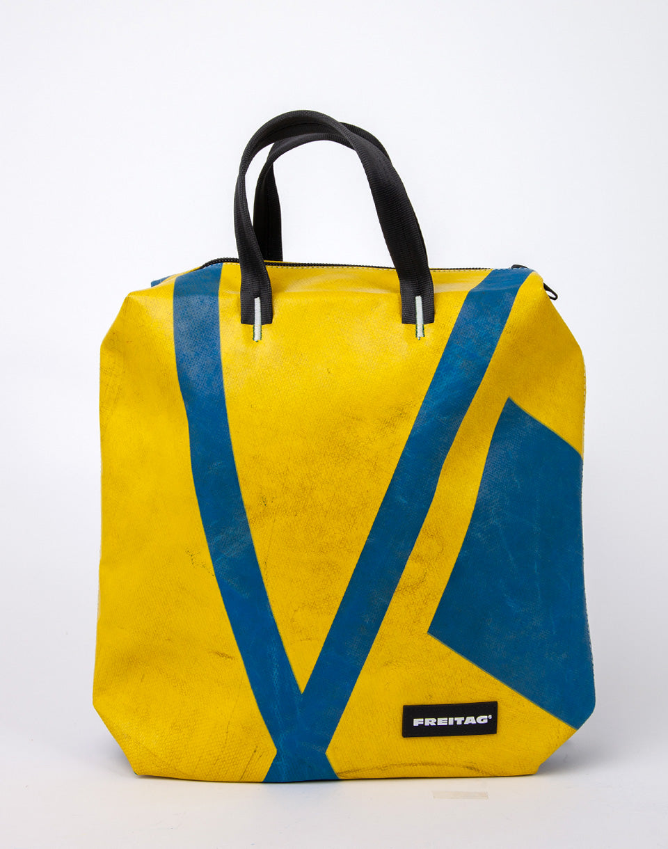 Freitag F201 Pete - Un sac à dos de ville unique à base de bâches de camion et de ceintures de sécurité d'occasion.