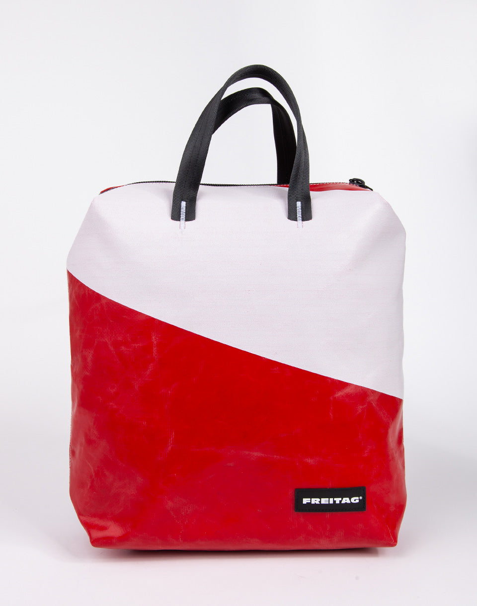 Freitag F201 Pete - Un sac à dos de ville unique à base de bâches de camion et de ceintures de sécurité d'occasion.