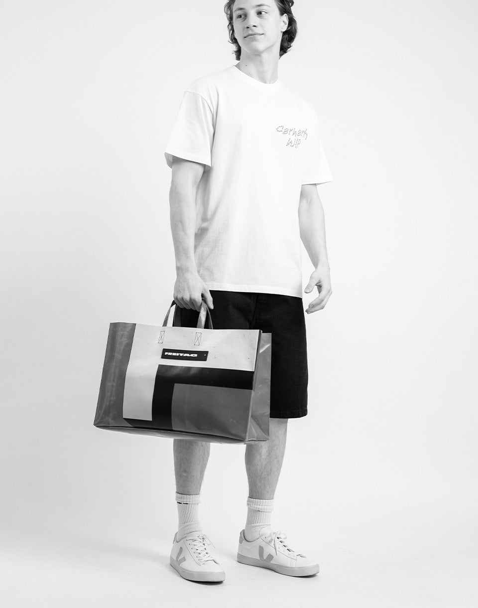 FREITAG F260 Miami Wide - a unique shopping bag made of recycled truck sails, which is based on the look of classic paper bags, but its width makes it unmistakable.