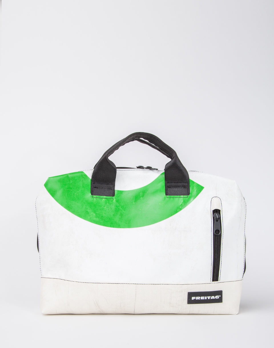Freitag F304 MOSS - Un sac d'ordinateur portable suisse unique à base de bâches de camion usagées, de ceintures de sécurité et de tubes à vélo.