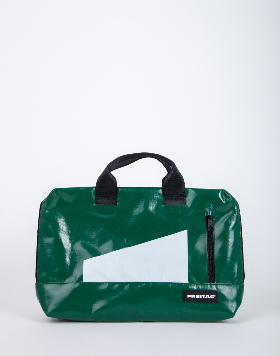 Freitag F304 MOSS - Un sac d'ordinateur portable suisse unique à base de bâches de camion usagées, de ceintures de sécurité et de tubes à vélo.