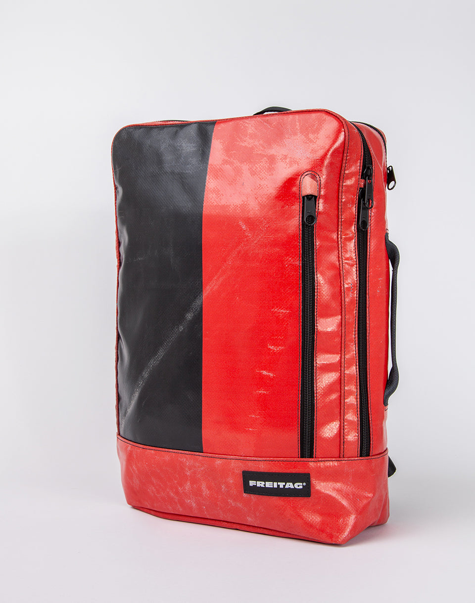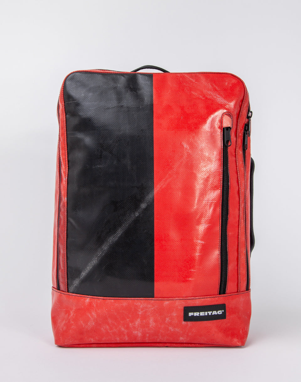 Freitag F306 Hazzard - Sac à dos suisse coupé à la main et cousu fabriqué à partir de bâches de camion et de ceinture de sécurité d'occasion.