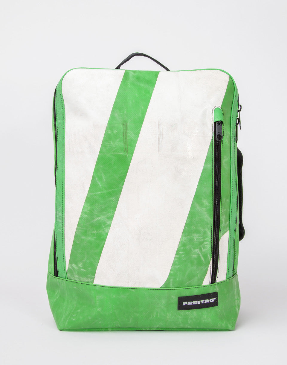 Freitag F306 Hazzard - Sac à dos suisse coupé à la main et cousu fabriqué à partir de bâches de camion et de ceinture de sécurité d'occasion.