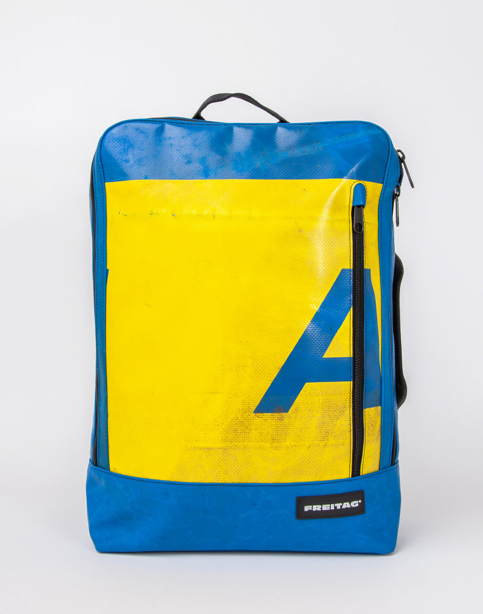 Freitag F306 Hazzard - Sac à dos suisse coupé à la main et cousu fabriqué à partir de bâches de camion et de ceinture de sécurité d'occasion.