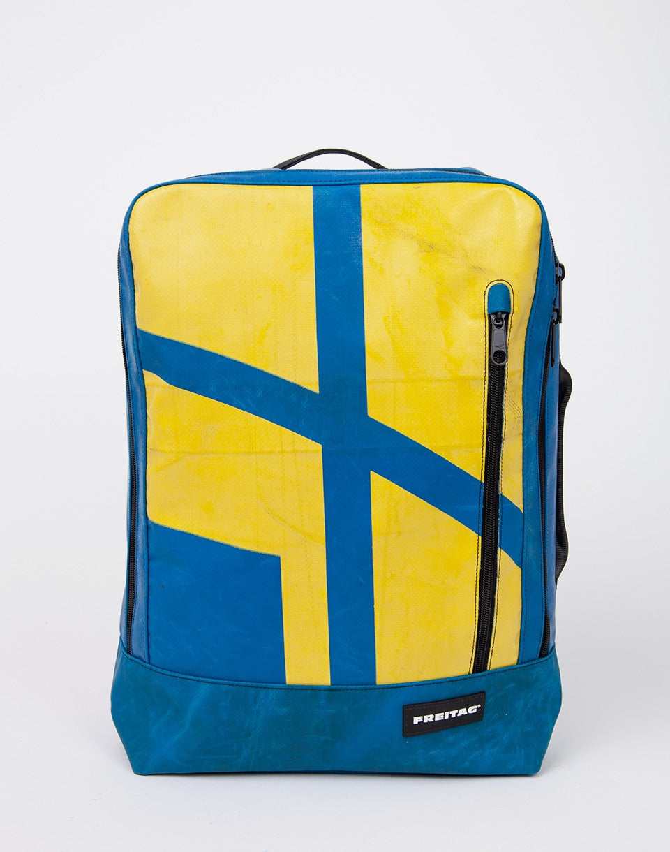 Freitag F306 Hazzard - Sac à dos suisse coupé à la main et cousu fabriqué à partir de bâches de camion et de ceinture de sécurité d'occasion.