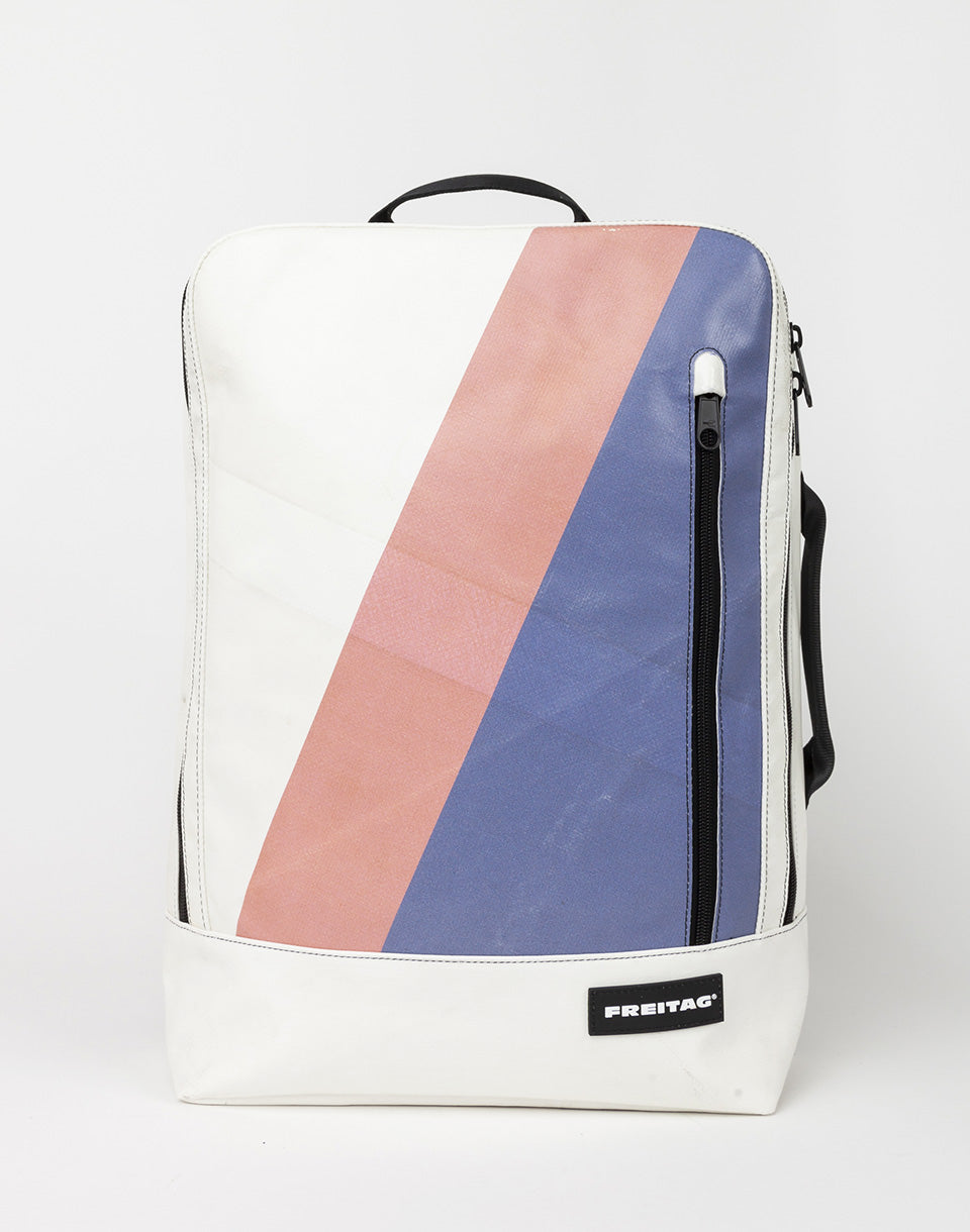 Freitag F306 Hazzard - Sac à dos suisse coupé à la main et cousu fabriqué à partir de bâches de camion et de ceinture de sécurité d'occasion.