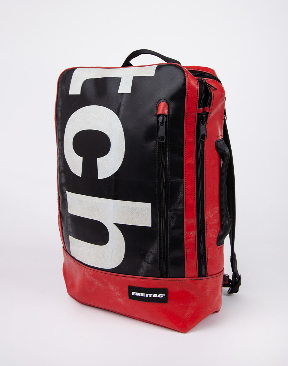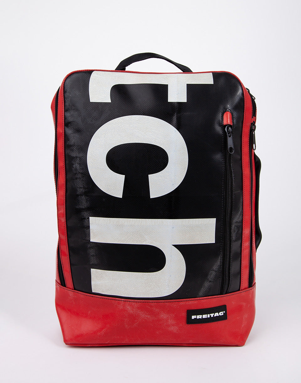 Freitag F306 Hazzard - Sac à dos suisse coupé à la main et cousu fabriqué à partir de bâches de camion et de ceinture de sécurité d'occasion.