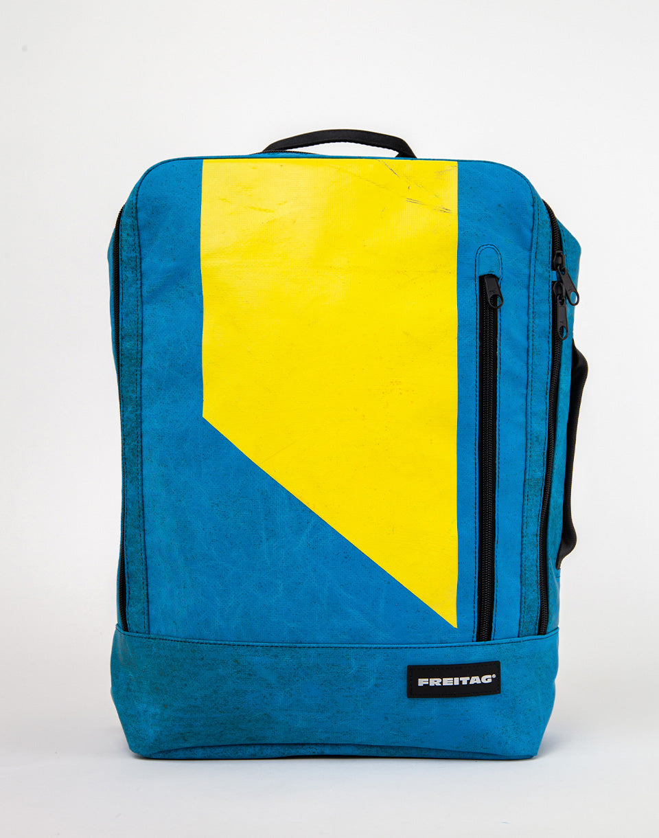Freitag F306 Hazzard - Sac à dos suisse coupé à la main et cousu fabriqué à partir de bâches de camion et de ceinture de sécurité d'occasion.