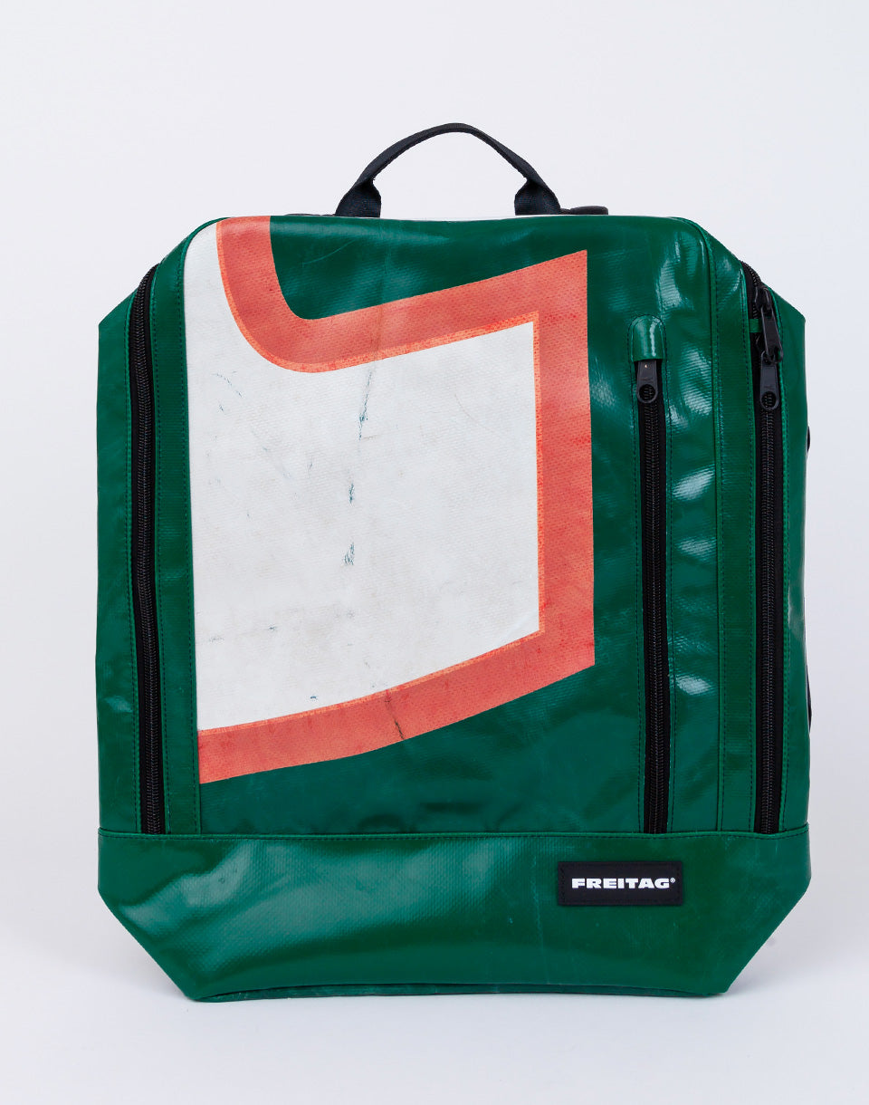 Freitag F306 Hazzard - Sac à dos suisse coupé à la main et cousu fabriqué à partir de bâches de camion et de ceinture de sécurité d'occasion.