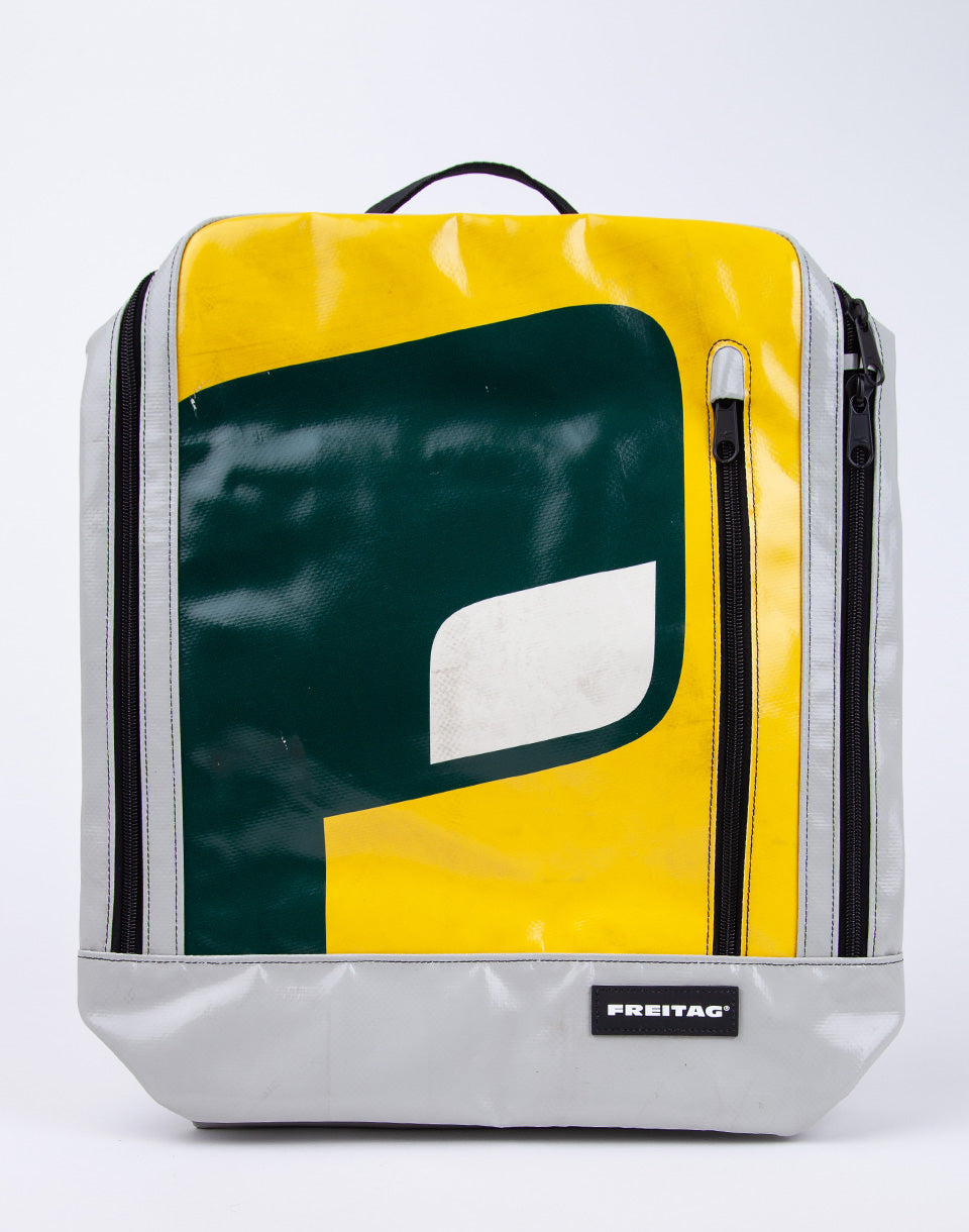 Freitag F306 Hazzard - Sac à dos suisse coupé à la main et cousu fabriqué à partir de bâches de camion et de ceinture de sécurité d'occasion.