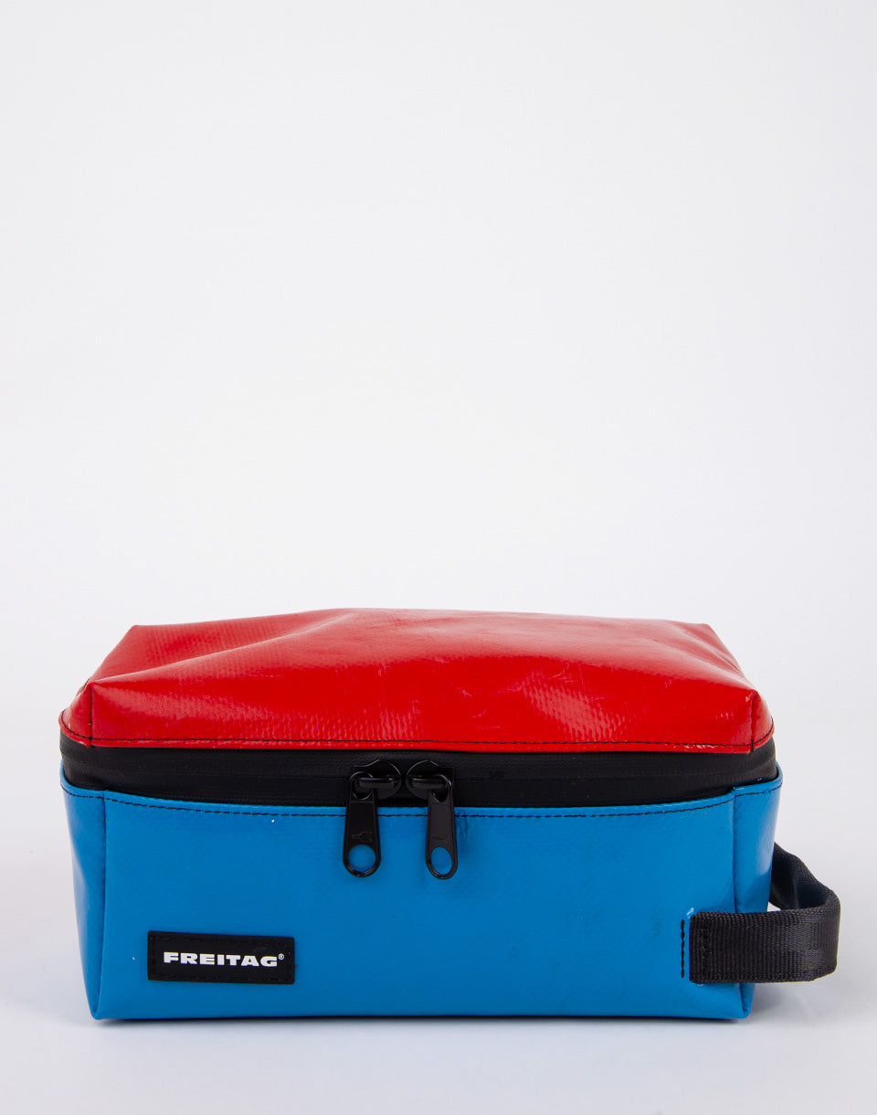 Freitag F36 Wayne - Sac de cosmétique de taille moyenne fabriqué à partir de bâches de camion d'occasion et de ceintures de sécurité recyclées. Grâce aux compartiments pratiques, ce sera un partenaire de voyage idéal.