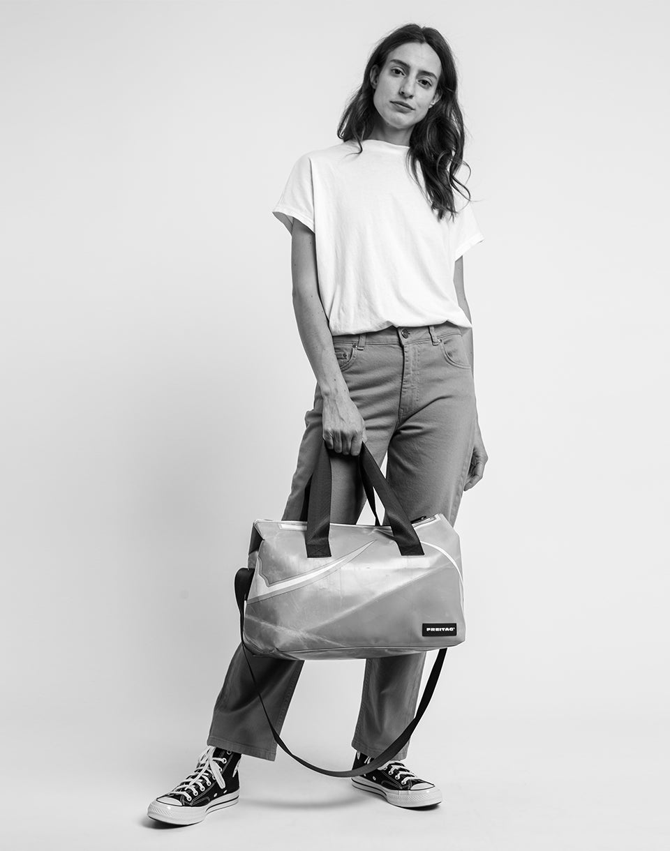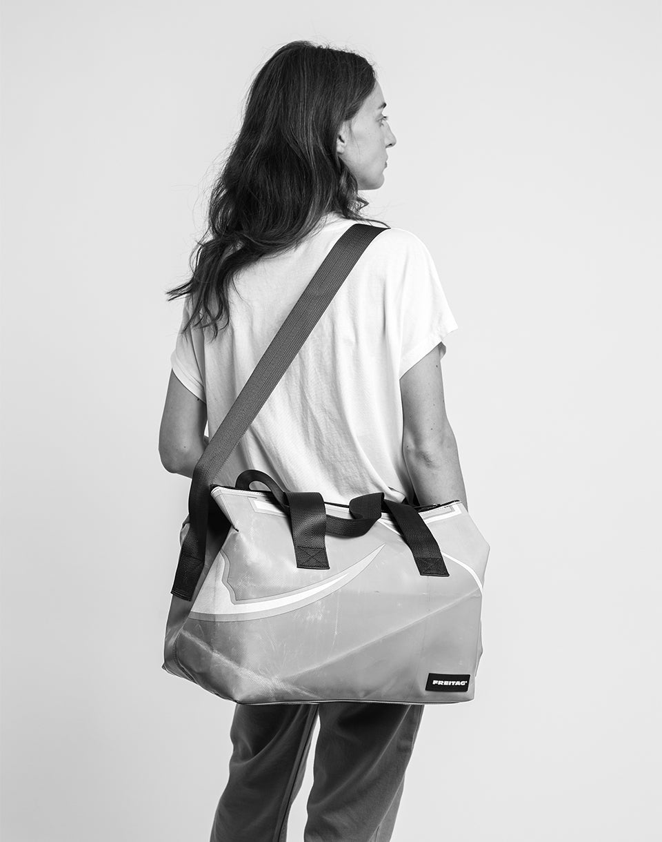 FREITAG F45 Lois - a medium-sized sports bag made from used truck tarps and the use of seat belts. It will please with a practical inner compartment to separate sweaty clothes from dry ones.