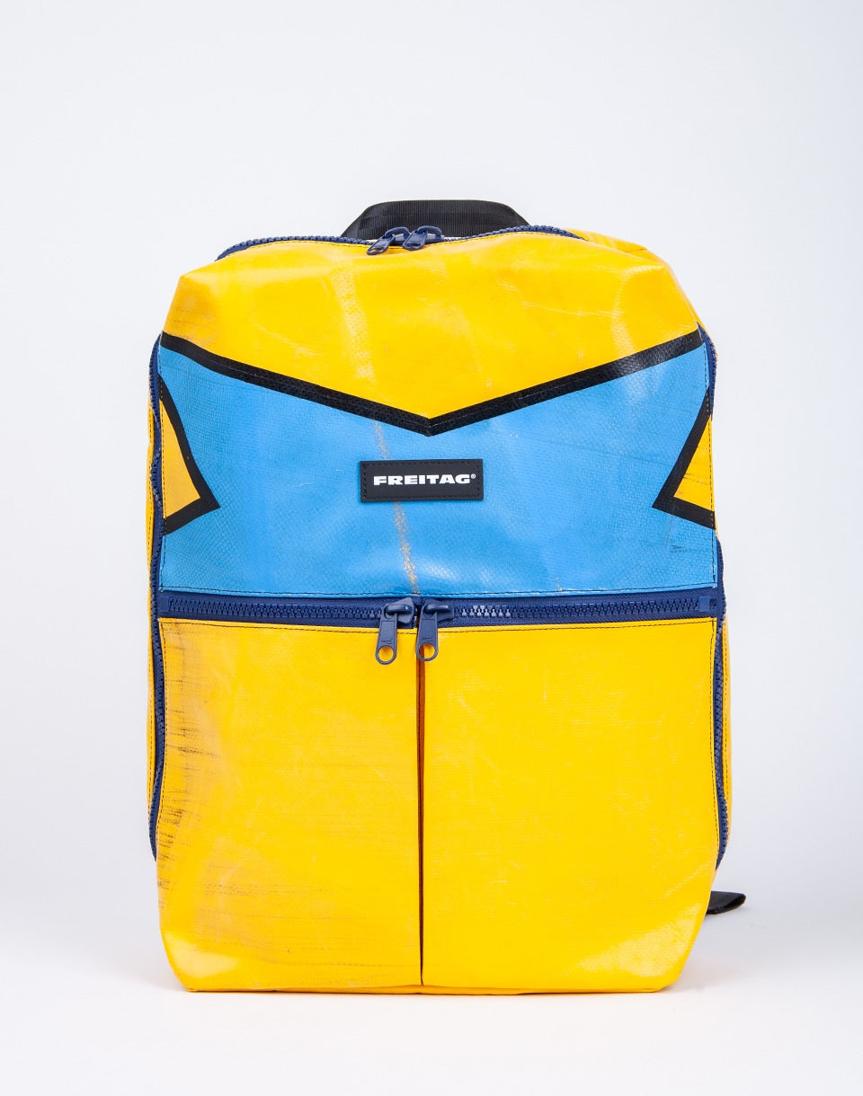 FREITAG F49 Fringe - un sac à dos unique fabriqué à la main en Suisse à partir de bâches de camion usagées et de ceintures de sécurité recyclées.