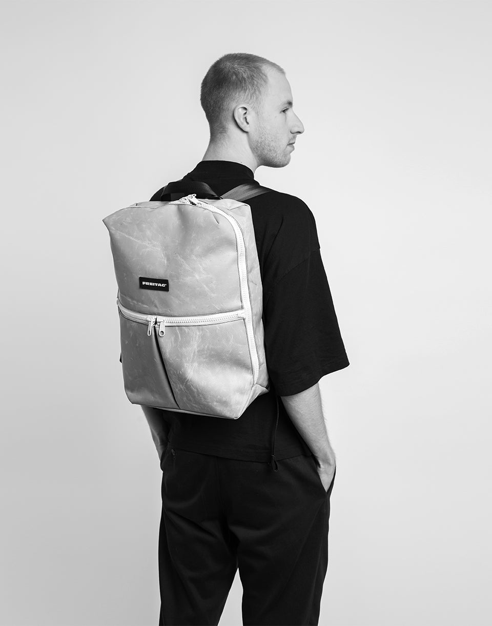 FREITAG F49 Fringe - a unique Swiss handmade backpack made from used truck tarps and recycled seat belts.