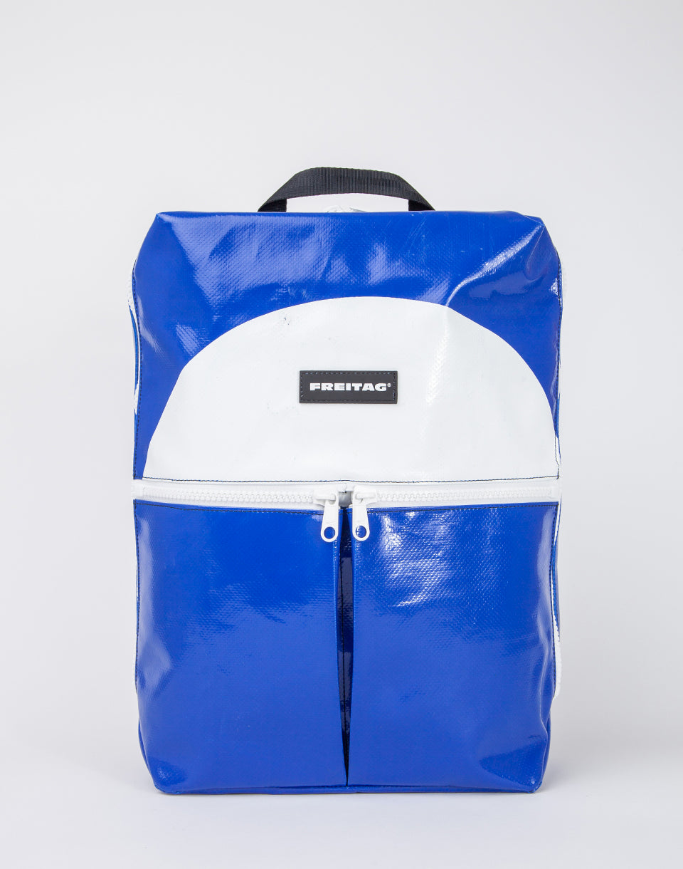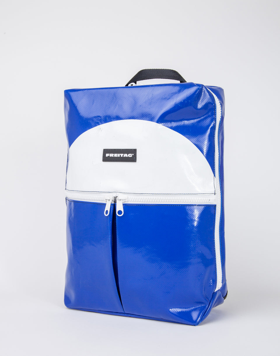 Freitag F49 Fringe - Un sac à dos fait à la main unique fait à partir de bâches de camion d'occasion et de ceintures de sécurité recyclées.
