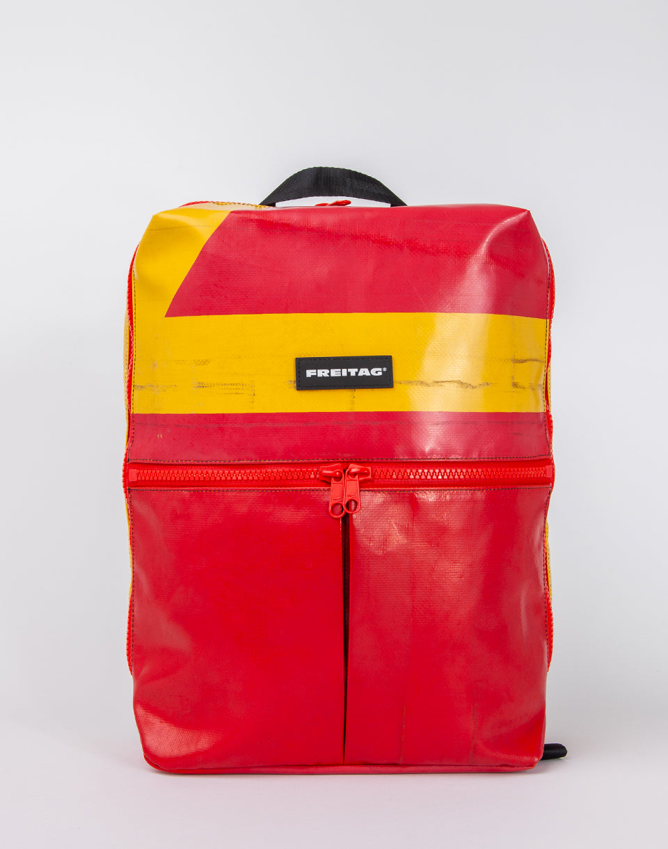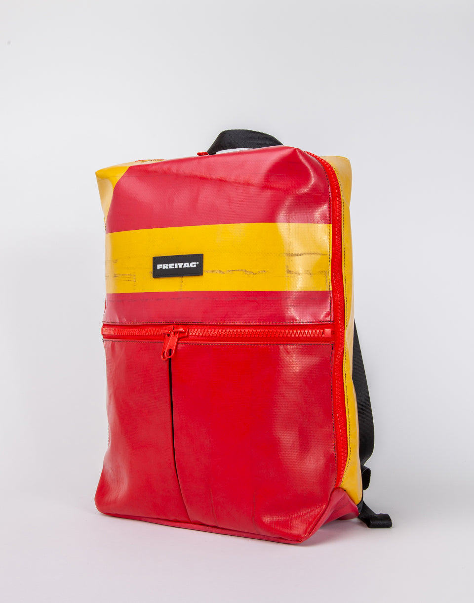 Freitag F49 Fringe - Un sac à dos fait à la main unique fait à partir de bâches de camion d'occasion et de ceintures de sécurité recyclées.