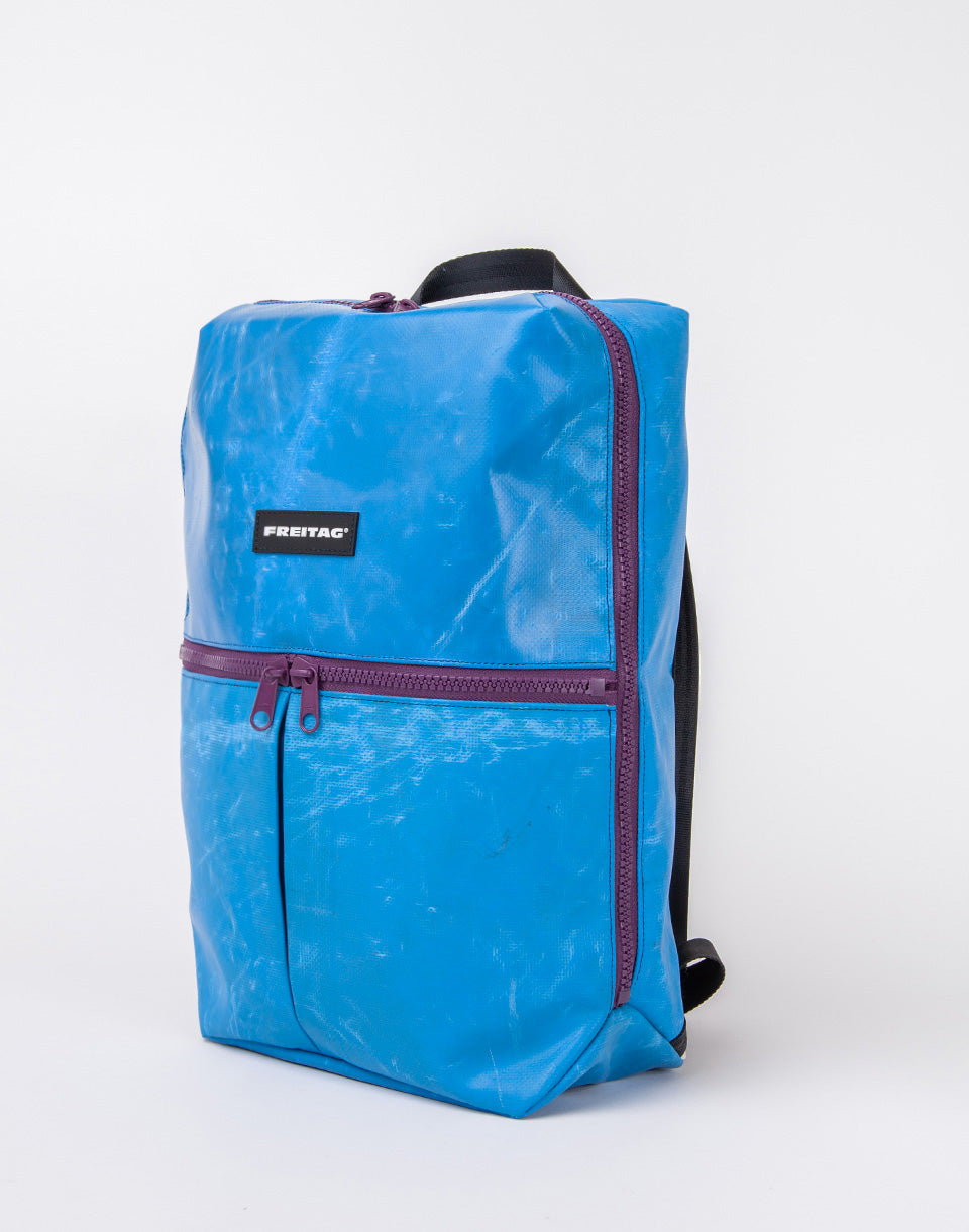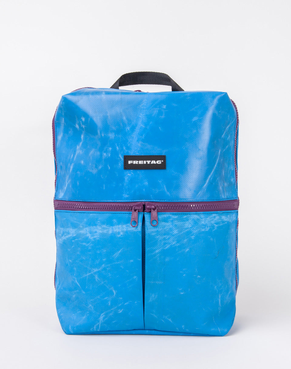 Freitag F49 Fringe - Un sac à dos fait à la main unique fait à partir de bâches de camion d'occasion et de ceintures de sécurité recyclées.