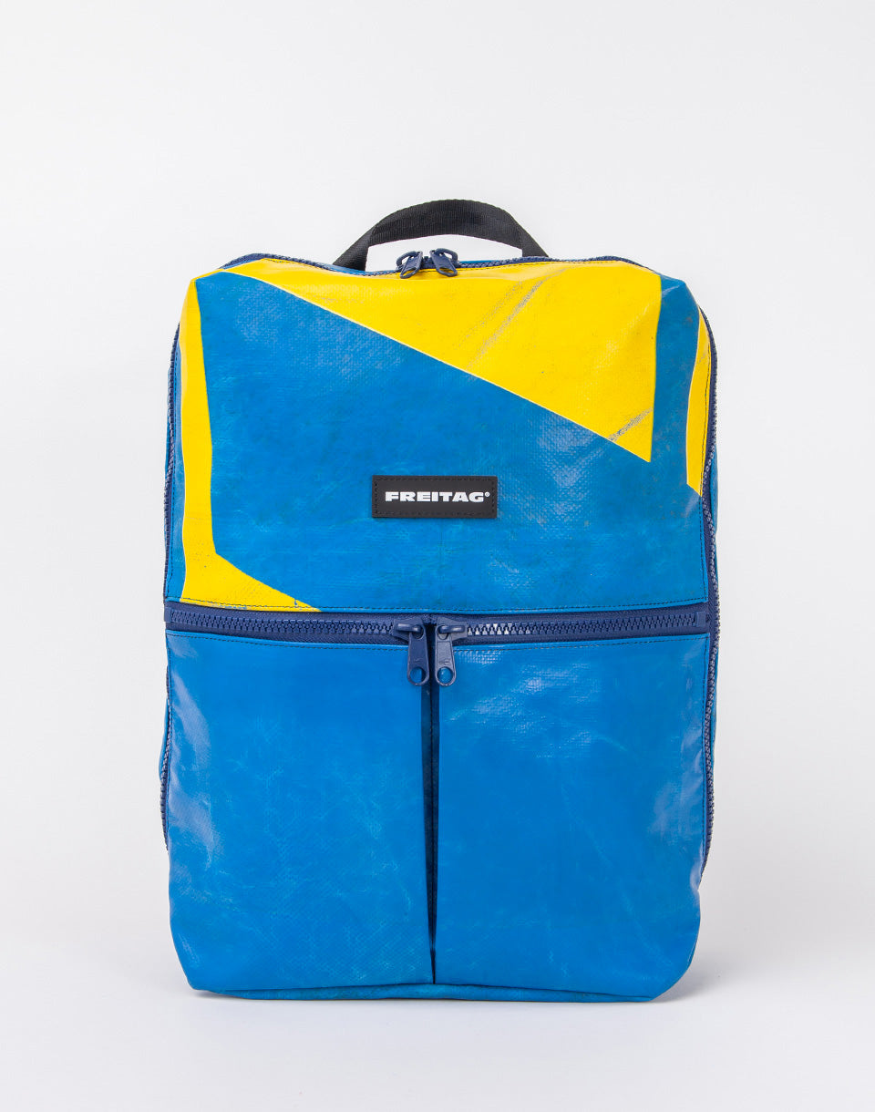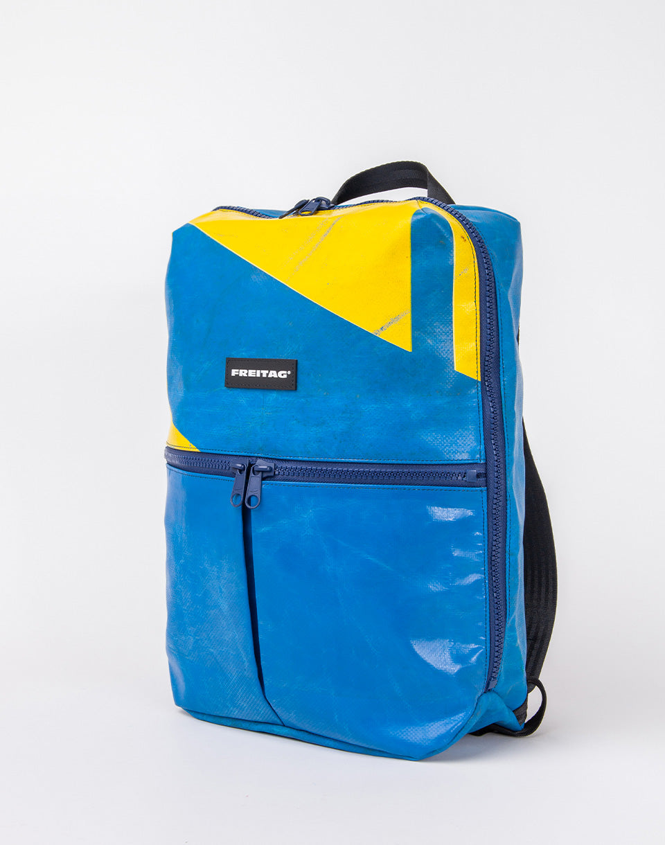 Freitag F49 Fringe - Un sac à dos fait à la main unique fait à partir de bâches de camion d'occasion et de ceintures de sécurité recyclées.