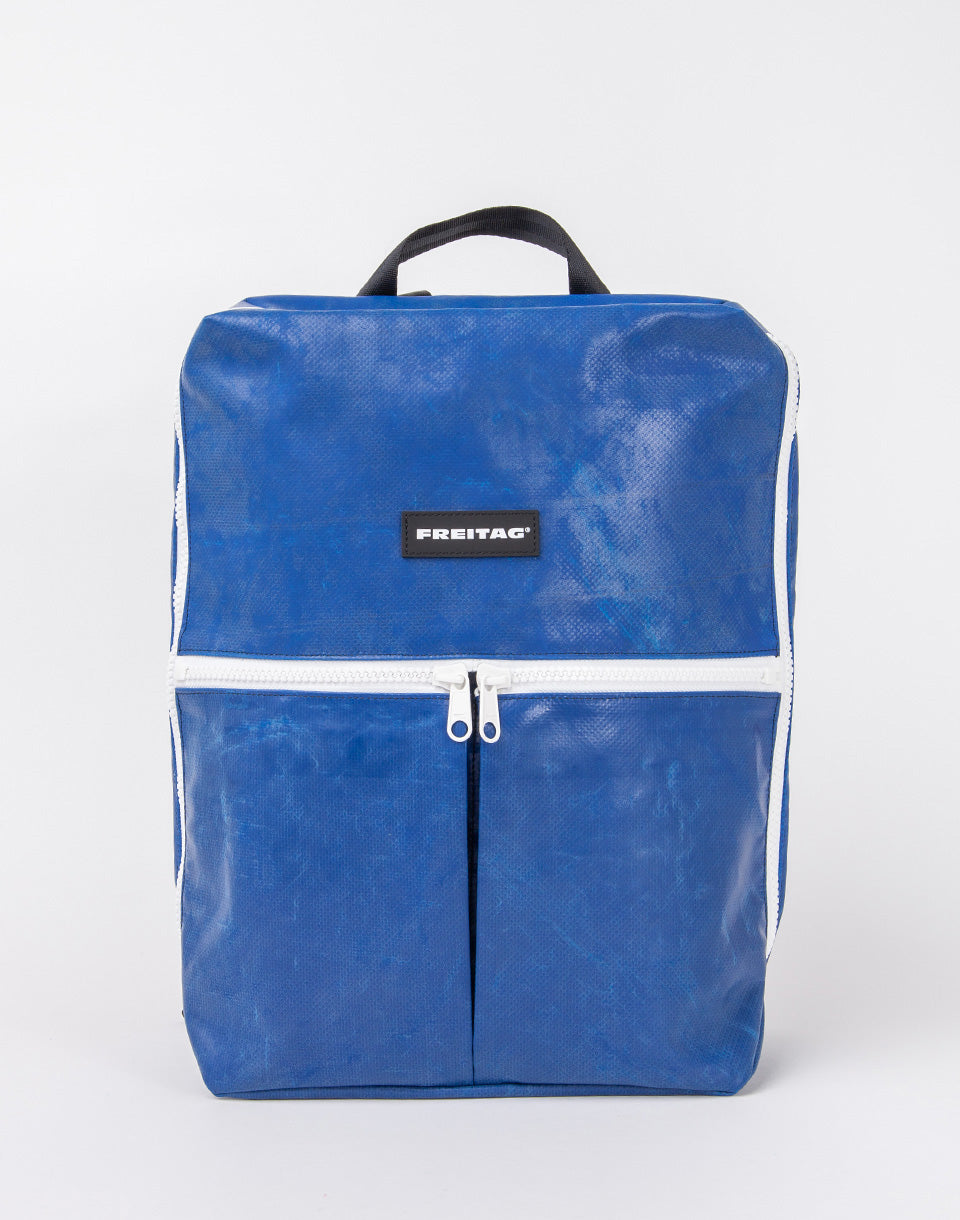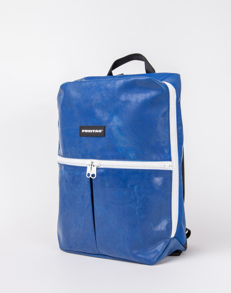 Freitag F49 Fringe - Un sac à dos fait à la main unique fait à partir de bâches de camion d'occasion et de ceintures de sécurité recyclées.