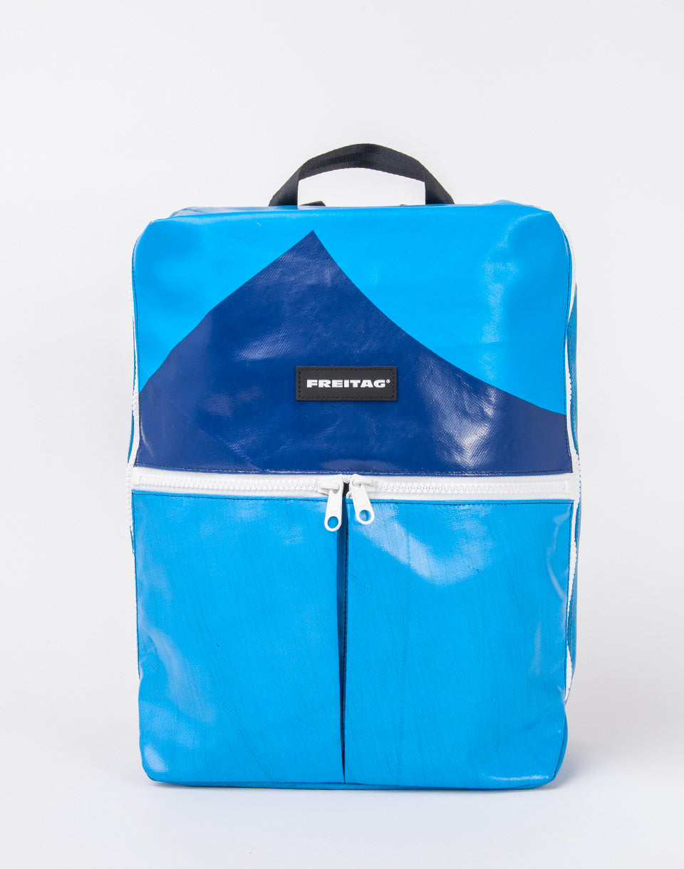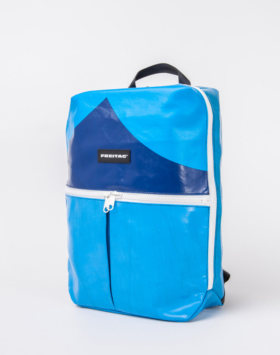 Freitag F49 Fringe - Un sac à dos fait à la main unique fait à partir de bâches de camion d'occasion et de ceintures de sécurité recyclées.