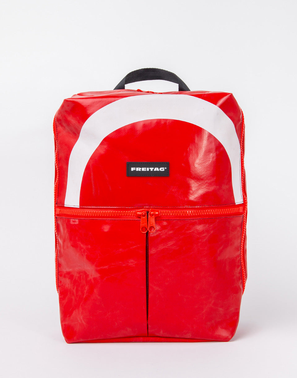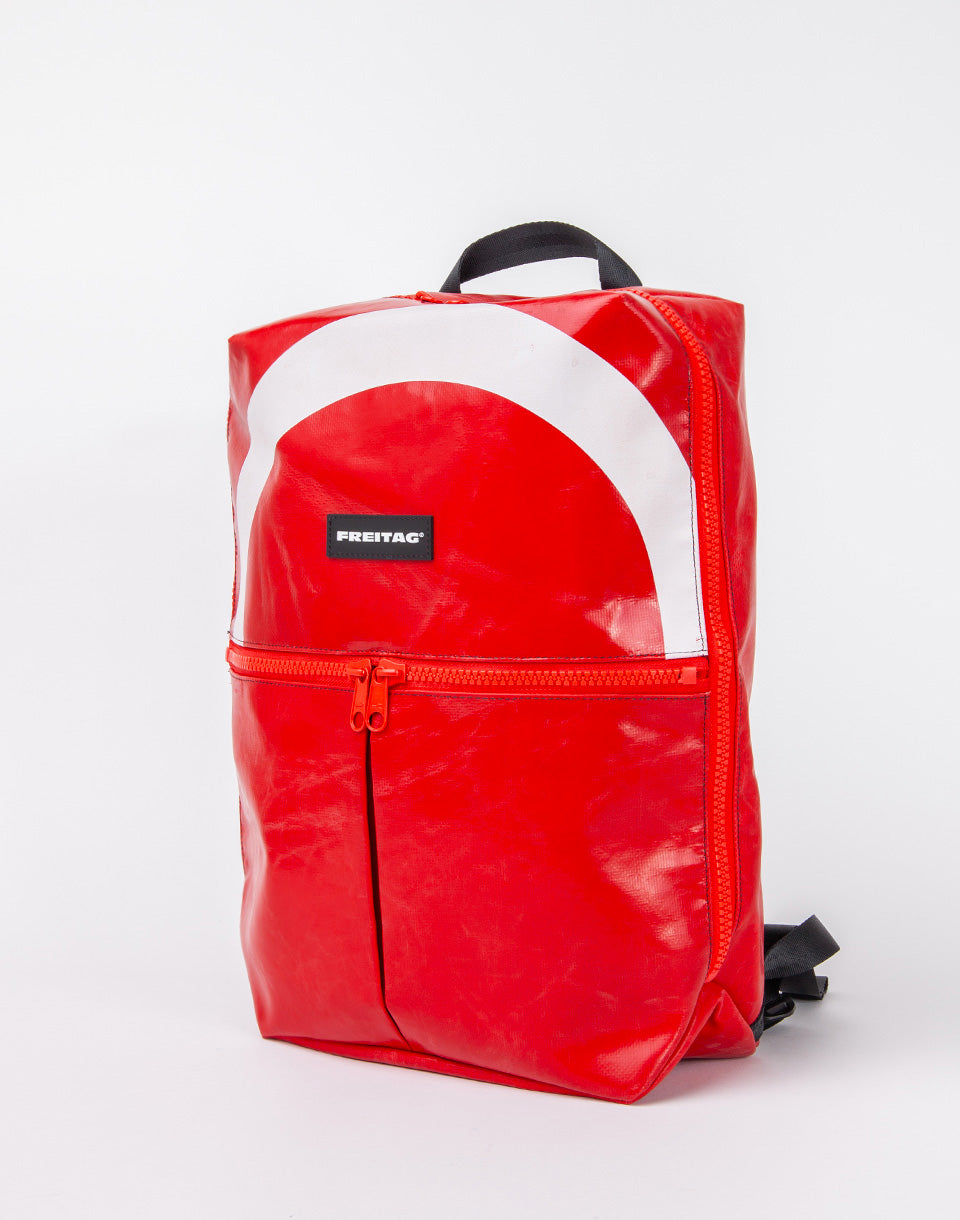 Freitag F49 Fringe - Un sac à dos fait à la main unique fait à partir de bâches de camion d'occasion et de ceintures de sécurité recyclées.
