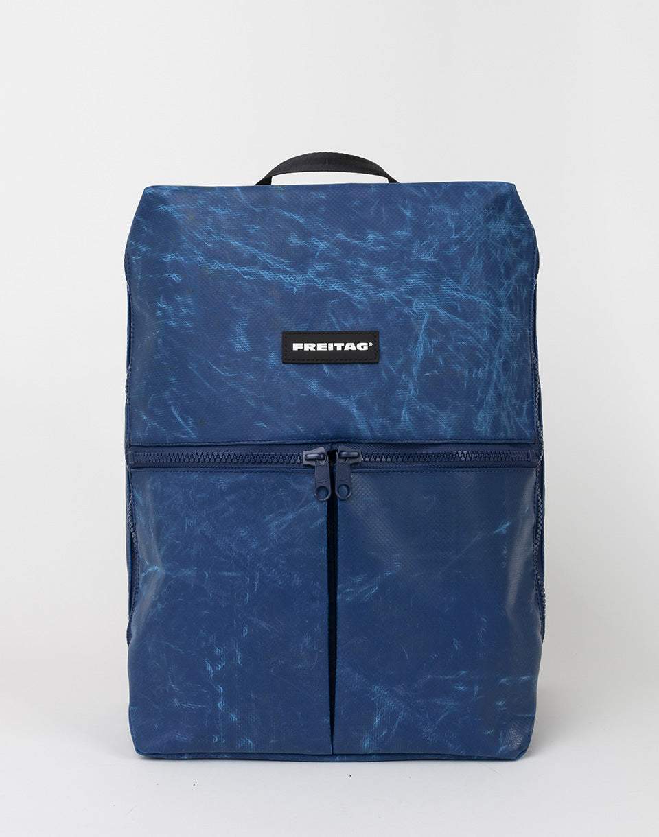 Freitag F49 Fringe - Un sac à dos fait à la main unique fait à partir de bâches de camion d'occasion et de ceintures de sécurité recyclées.