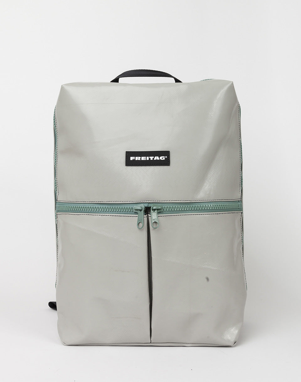 Freitag F49 Fringe - Un sac à dos fait à la main unique fait à partir de bâches de camion d'occasion et de ceintures de sécurité recyclées.