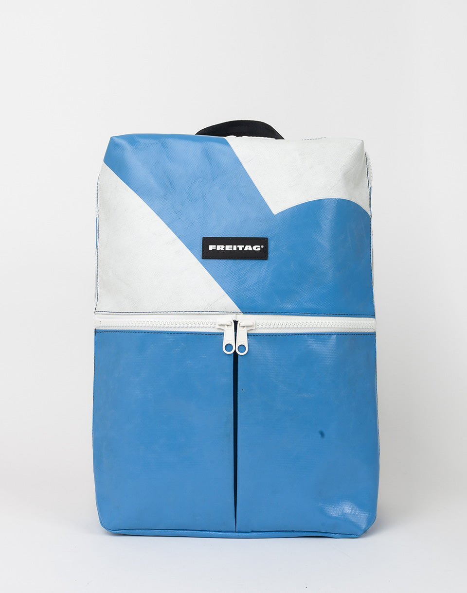 Freitag F49 Fringe - Un sac à dos fait à la main unique fait à partir de bâches de camion d'occasion et de ceintures de sécurité recyclées.