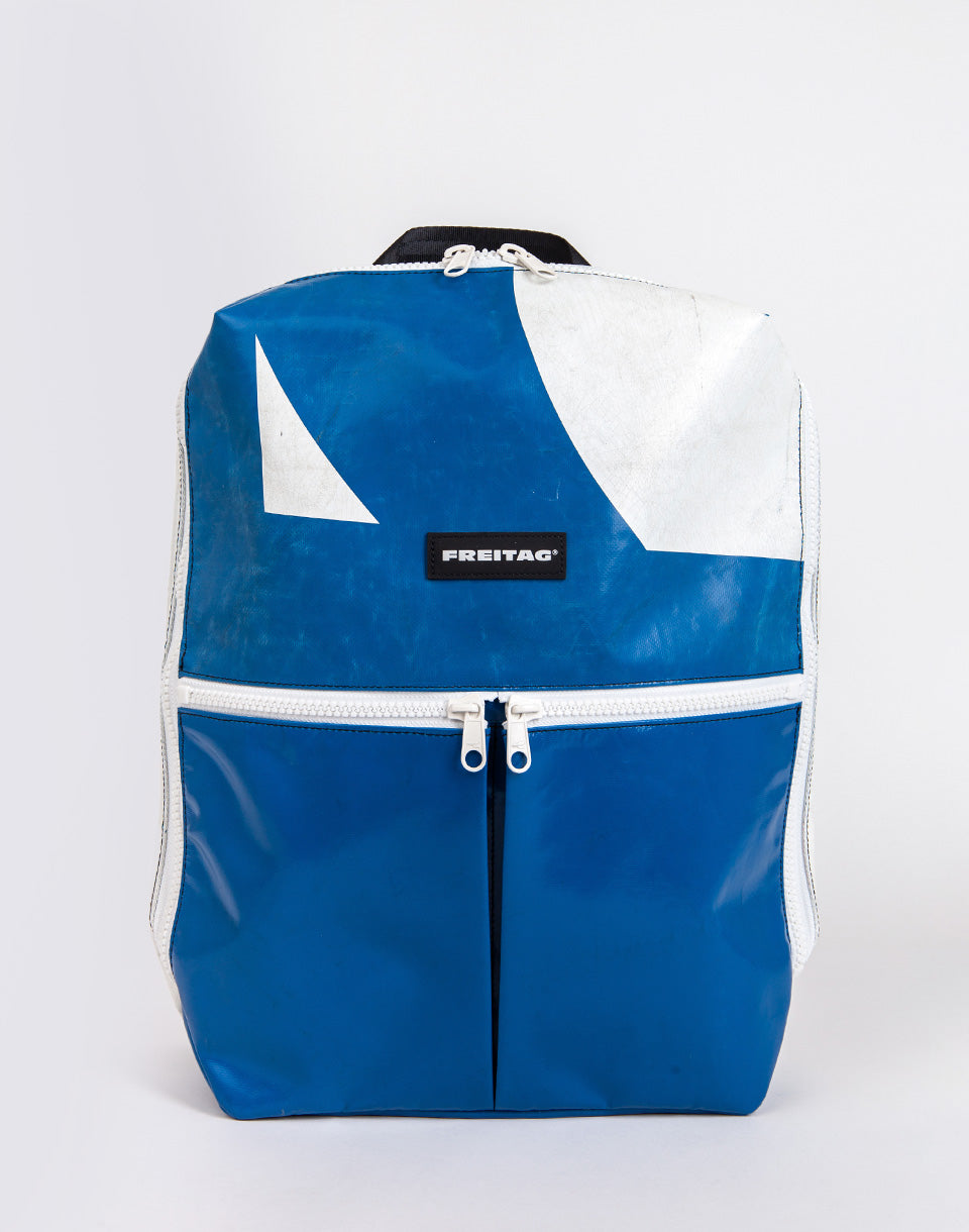 Freitag F49 Fringe - Un sac à dos fait à la main unique fait à partir de bâches de camion d'occasion et de ceintures de sécurité recyclées.