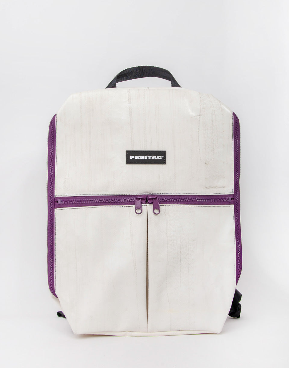 Freitag F49 Fringe - Un sac à dos fait à la main unique fait à partir de bâches de camion d'occasion et de ceintures de sécurité recyclées.