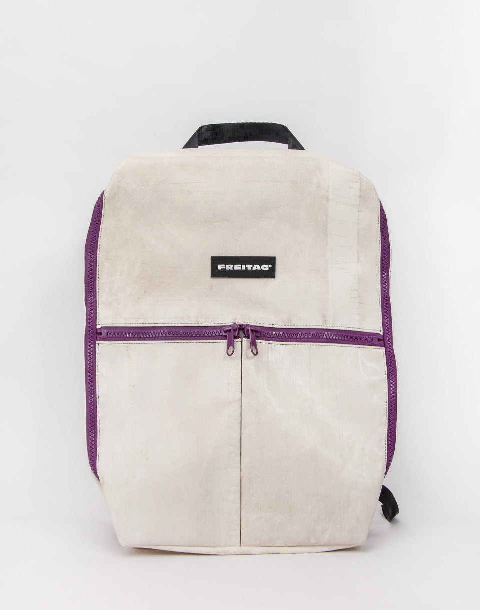 Freitag F49 Fringe - Un sac à dos fait à la main unique fait à partir de bâches de camion d'occasion et de ceintures de sécurité recyclées.