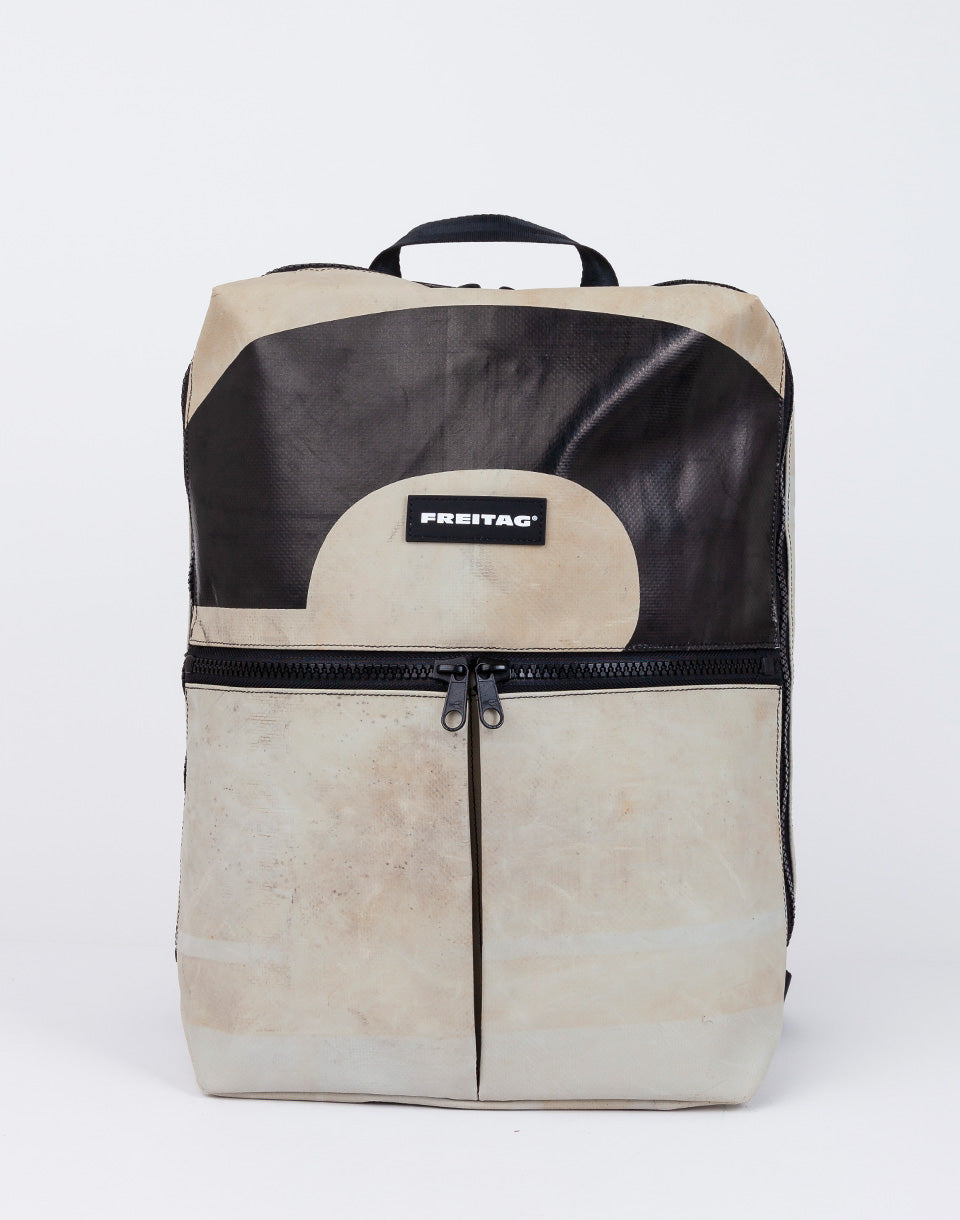 Freitag F49 Fringe - Un sac à dos fait à la main unique fait à partir de bâches de camion d'occasion et de ceintures de sécurité recyclées.